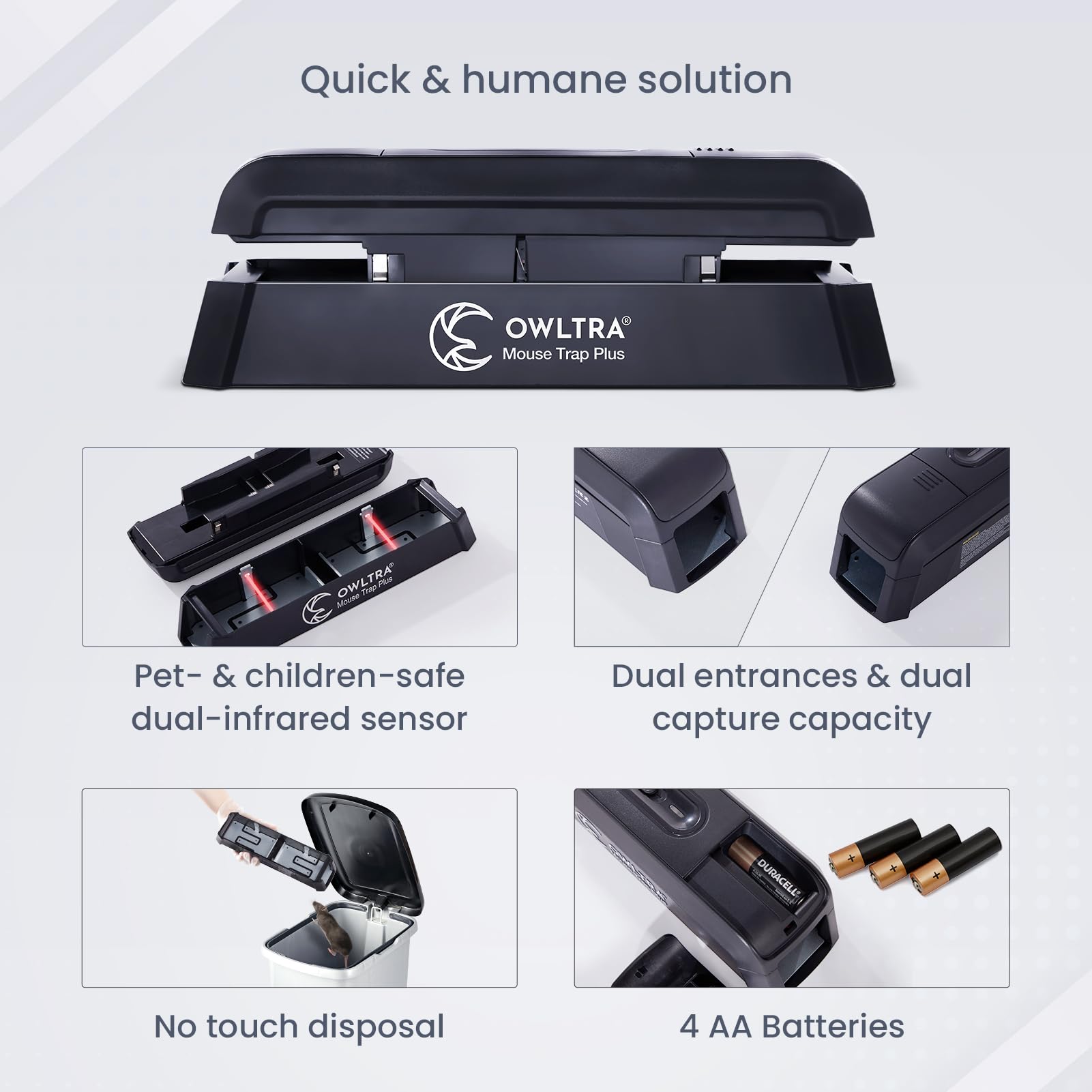The Humane Solution: The OWLTRA EMZ Plus Electric Mice Trap is a humane solution for eliminating mice and rodents. It features dual entrances that allow mice and rodents to enter from either side of the trap and can capture two rodents simultaneously. Equipped with a dual-infrared sensor, it prevents accidental triggering by pets and children. When triggered, it delivers a high-voltage shock (5000-8000 volts for 120 seconds) for effective extermination. Quick, humane, and safe.
