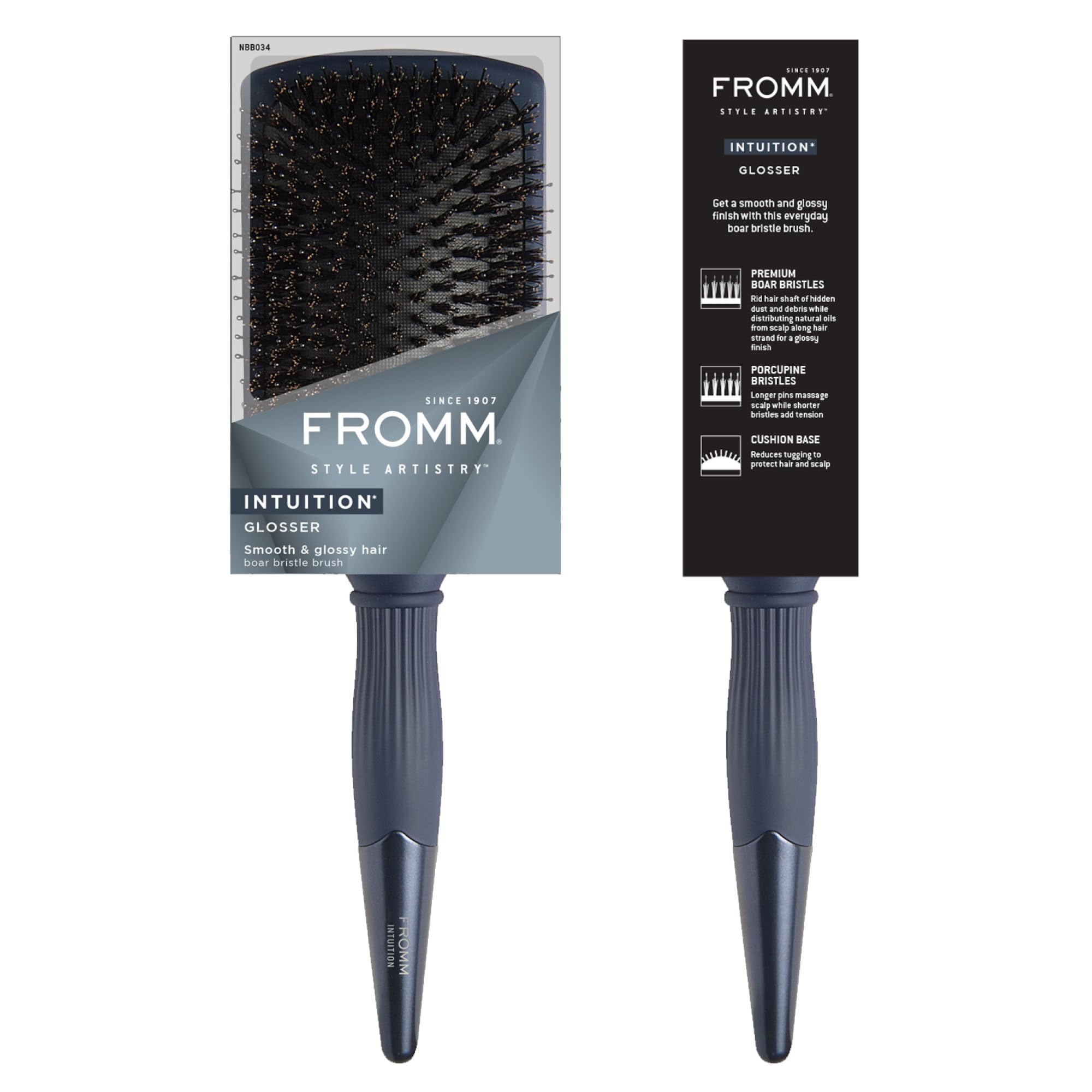 Fromm Intuition Glosser Boar Bristle Paddle Brush is designed for detangling and finishing hair styles. Premium boar bristles add unparalled shine making it ideal for styling dry hair and brushing out curls. The porcupine bristles make it easy to detangle thicker, wavy or curly hair since the longer pins can penetrate to the scalp. It's also suitable for thinner hair; the pins have gentle rounded tips that also provide an invigorating massage. The flexible cushion and pins further protect hair. The soft matte finish is comfortable to hold and a beautiful complement to any salon station or bathroom vanity. Fromm has been serving hair stylists for over 100 years. We are proud to be a part of this passionate and creative community. Our curated hair tool collections boast the latest technology plus superior materials and craftsmanship for unparalleled performance and all our tools feature sophisticated modern design and beautiful finishes. Fromm stands behind hairstylists everyday to help them deliver outstanding results and elevate the experience of every guest. Fromm is the only multi-category brand that can outfit an entire salon with distinctly designed collections that include everything from shears and brushes to color accessories and towels.