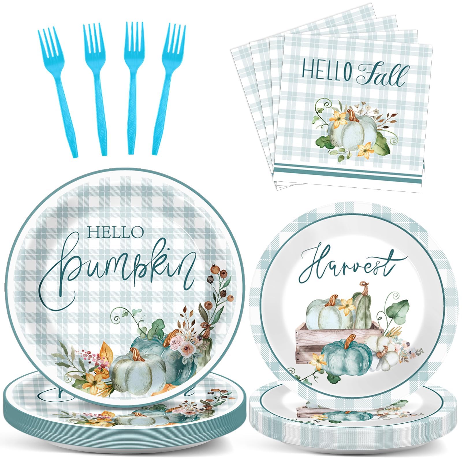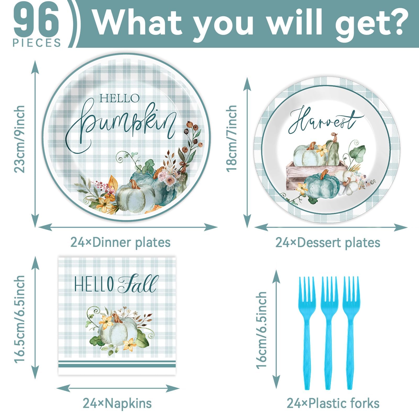 Package included: You will receive 24 9" fall pumpkin paper plates, 24 7" fall pumpkin paper plates, 24 6.5" fall pumpkin napkins, and 24 plastic forks, each set can serve 24 guests.