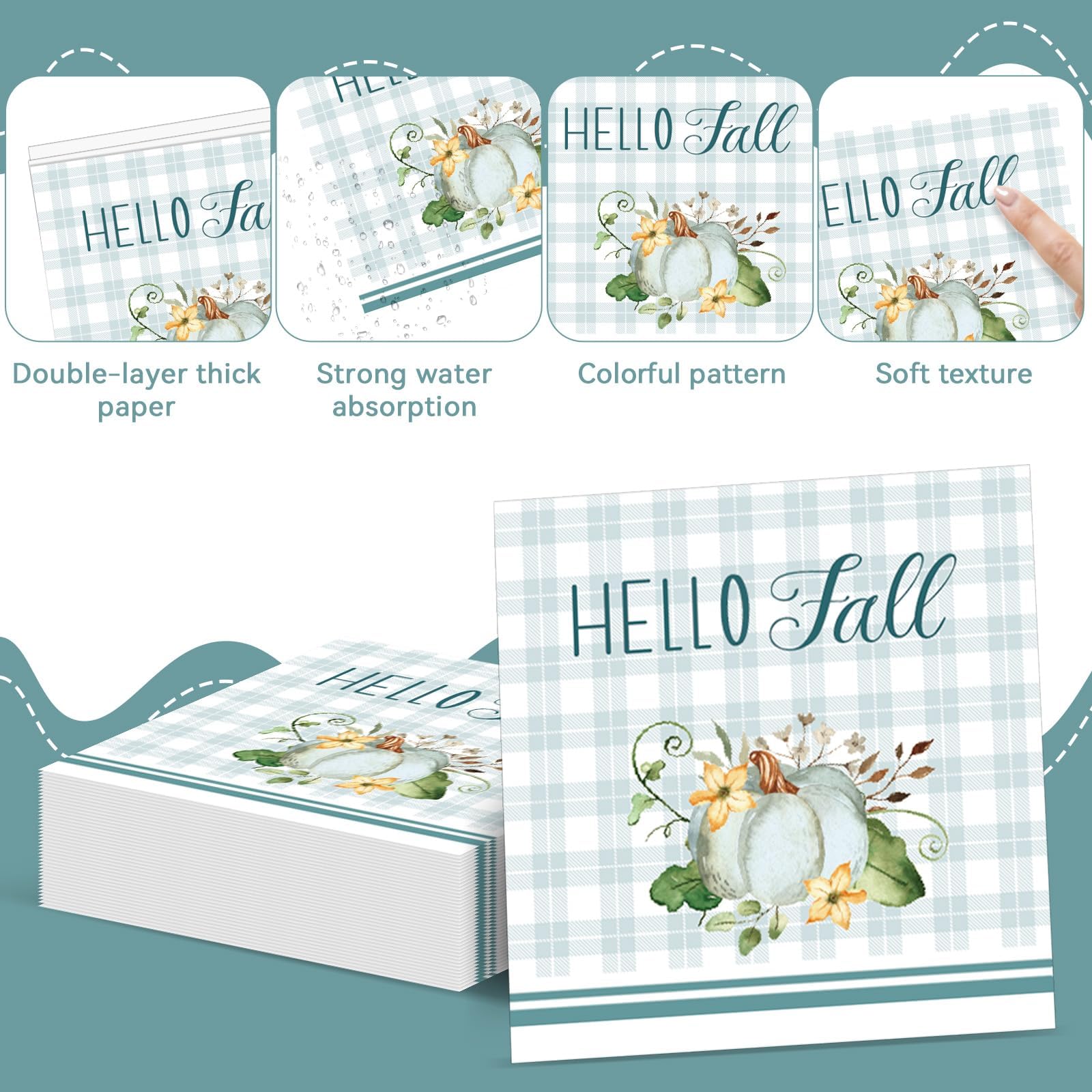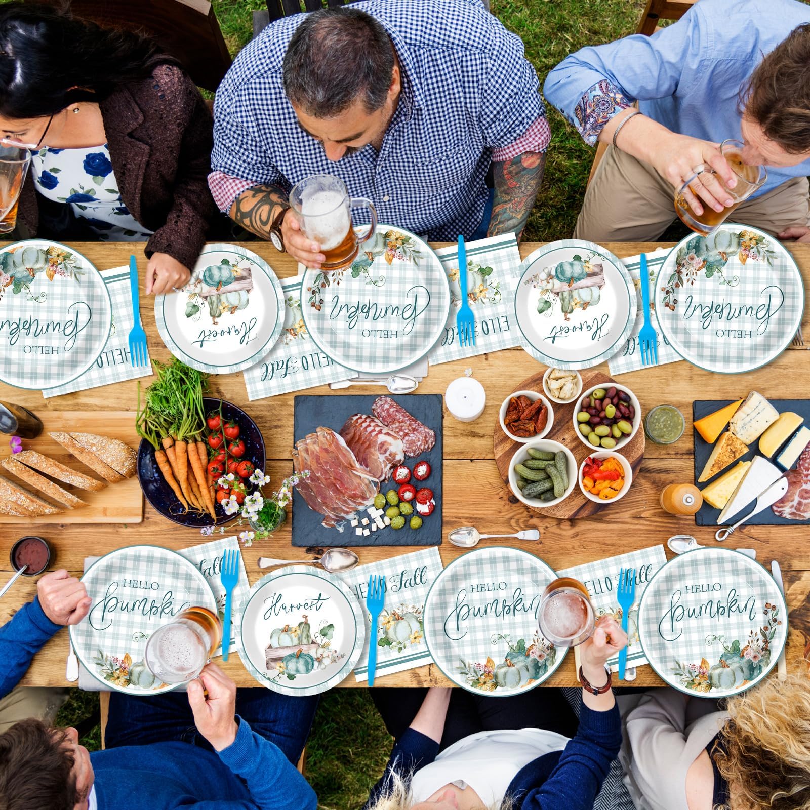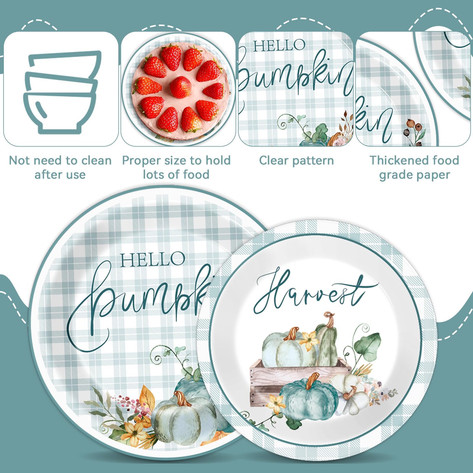 Fall pumpkin design: The watercolor pumpkin tableware design is the wonderful addition to your fall seasonal theme and atmosphere, with farmhouse pumpkins, fall blue plaid, with words" Hello pumkin" "harvest" "hello fall", make a memorable and meaningful party with this exquisite fall party tableware.