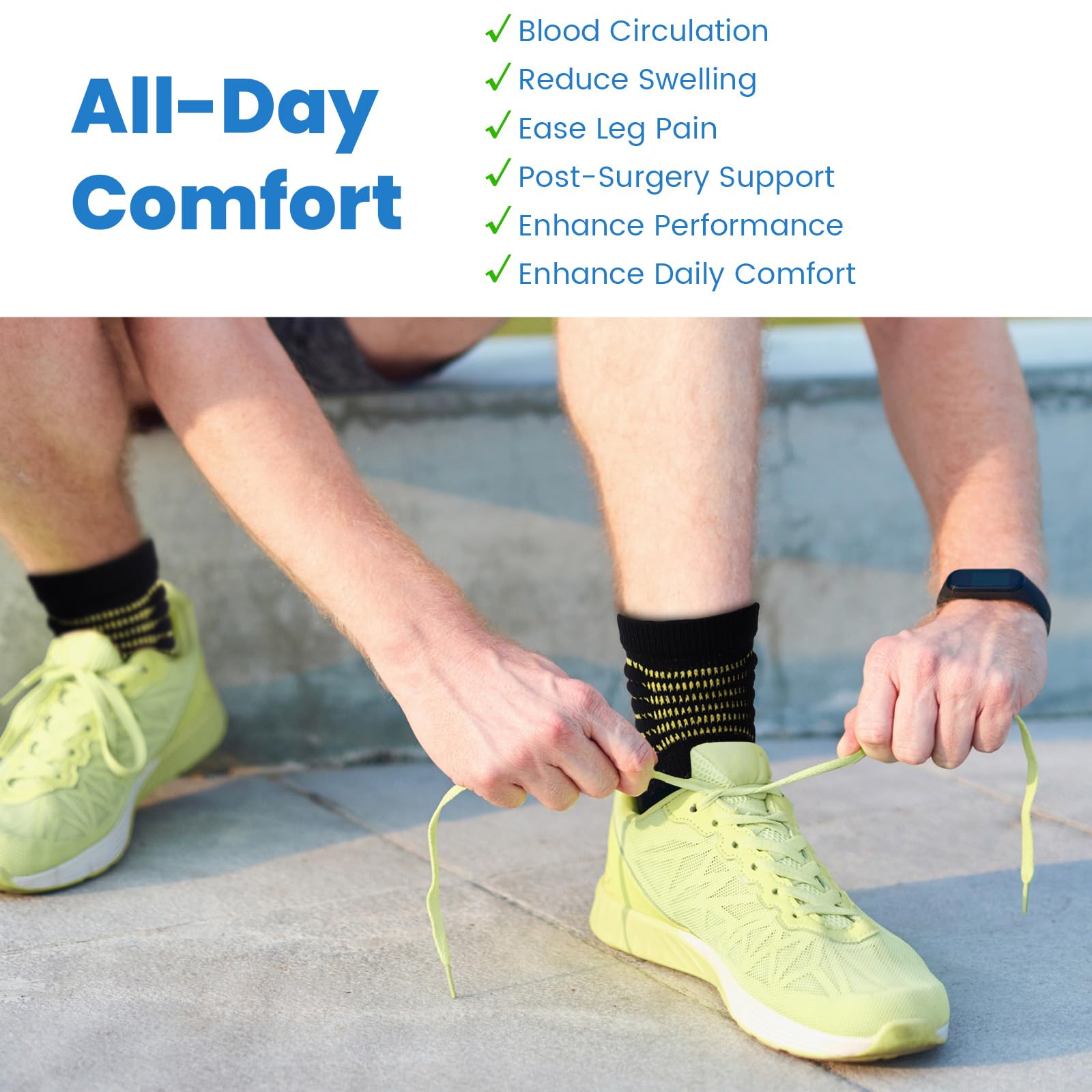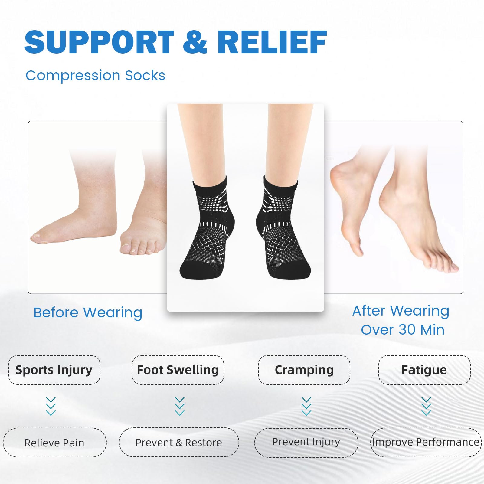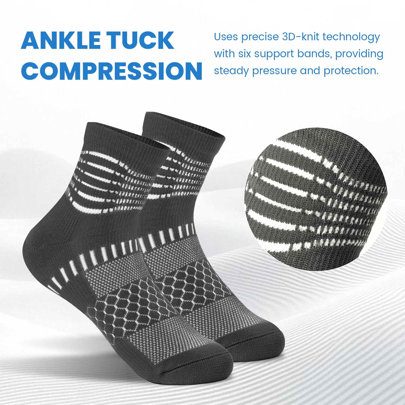 Stay Supported Stay Active – 6 ankle compression rings and reinforced arch support keeps you stable. Whether you're running working or recovering these socks help fight foot fatigue and plantar fasciitis pain.