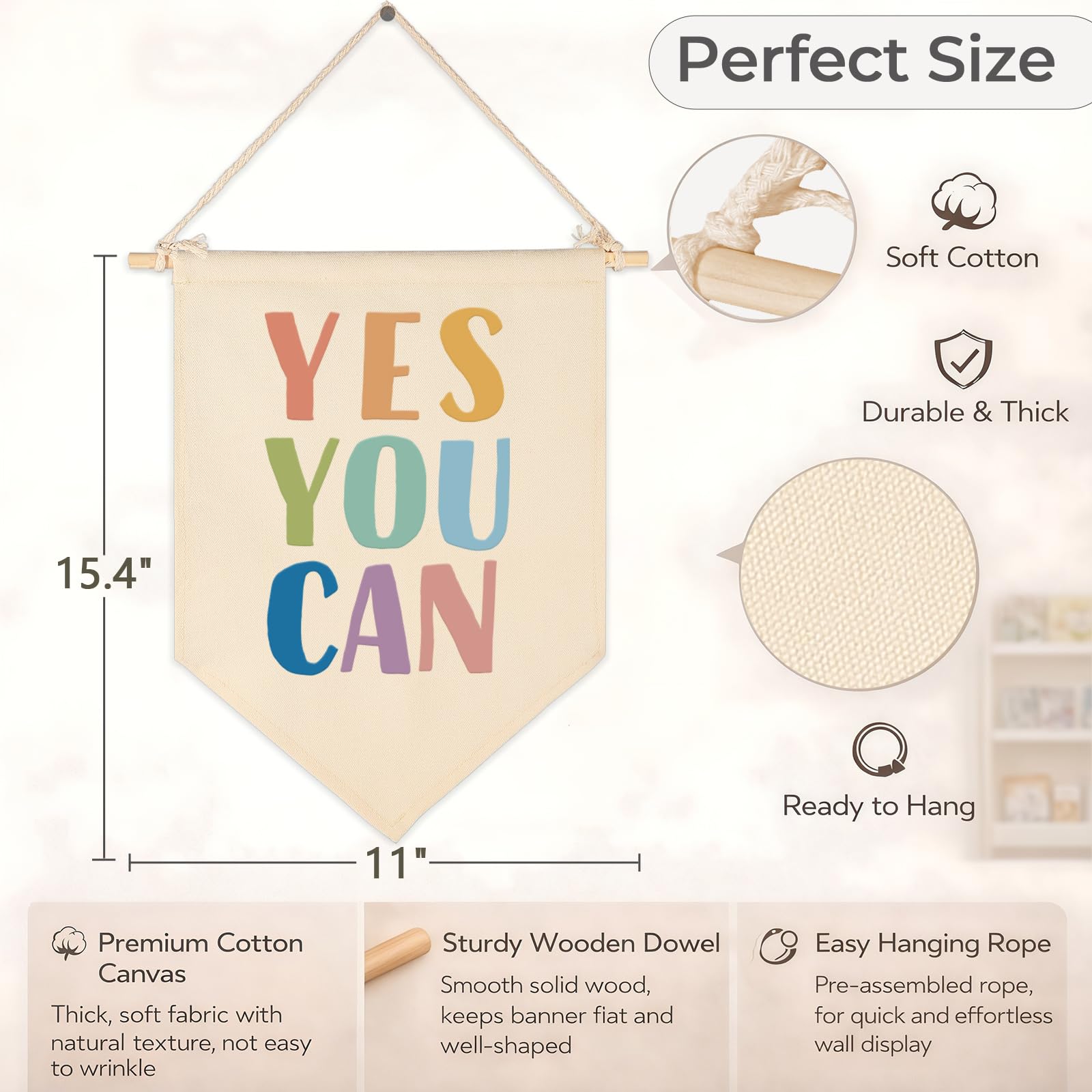 Inspire limitless potential in your educational space with our YES YOU CAN Canvas Hanging Flag. Measuring 15.4 x 11 inches, this vibrant piece of wall art is specifically designed for the heart of the school—from bustling kindergarten classrooms to peaceful counseling suites and dedicated quiet corners. The bold, multi-colored lettering serves as a universal language of encouragement, reminding students that they have the power to overcome any challenge. Made from premium, heavy-duty cotton canvas and supported by a sturdy 11-inch wooden dowel, this high-quality banner is built to withstand the energy of a classroom while maintaining its professional charm. Whether you are decorating a room to boost student morale or looking for a heartfelt gift for a fellow teacher, this ready-to-hang pennant provides the perfect blend of motivation and aesthetic decor.