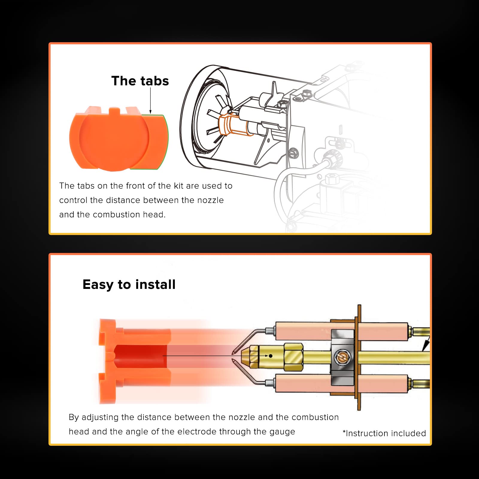 Are you worried about the situation that the burner did not respond to the repeated ignition or the black smoke emitted around the burner after ignition? This gauge kit can solve your problems perfectly. The convex part on the top of the gauge is the locator set for the electrode, which is used to adjust the angle of the electrode to meet the factory specification. The tabs at the front of the gauge are used to control the distance between the nozzle and the retention head, so as to achieve more full combustion and avoid black smoke.This kit makes the nozzle setting simple and accurate, reducing your time and trouble.