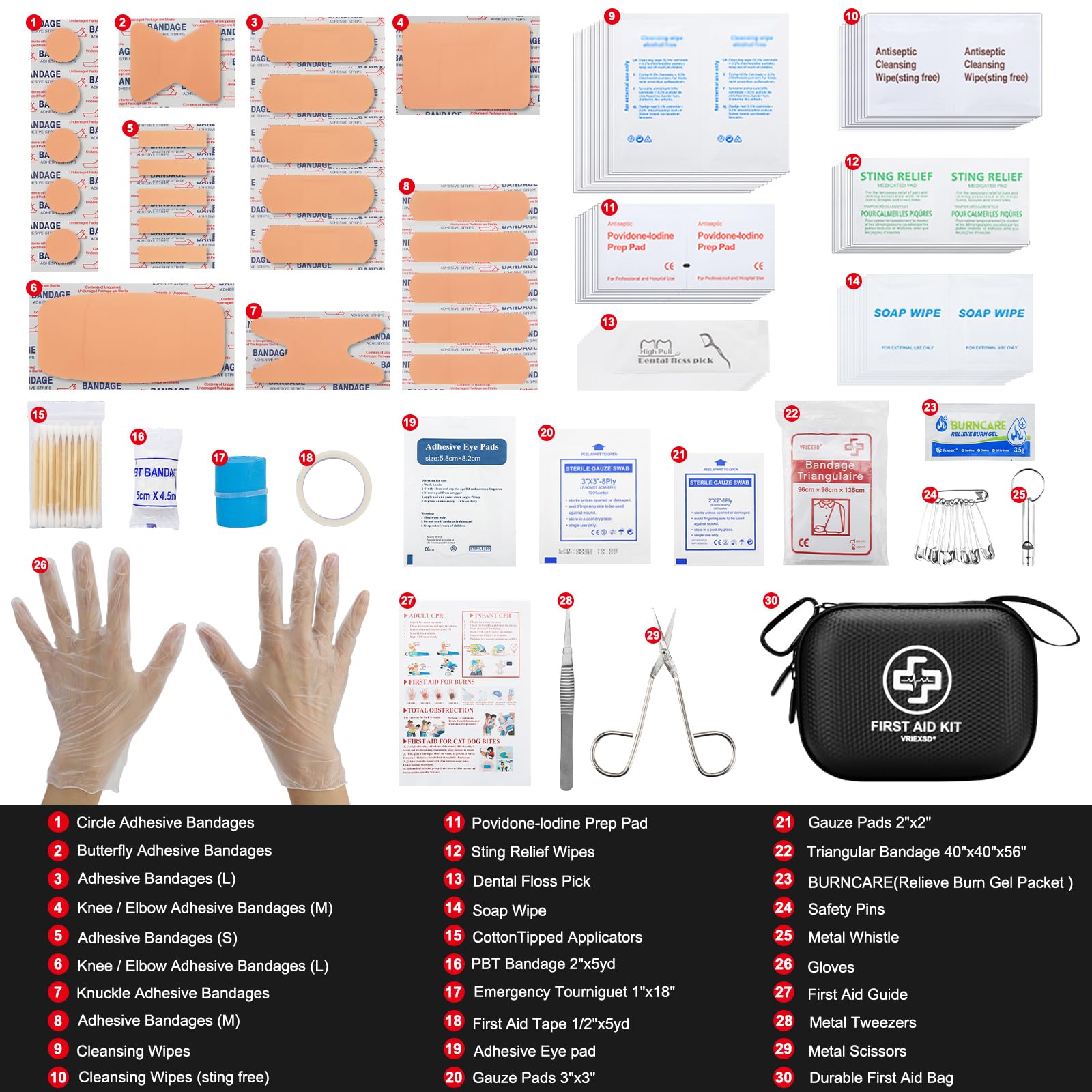 ESSENTIALS FOR EMERGENCY: Everything you need is in this first aid kit! Our kit includes over 150 professional-grade medical and safety supplies, all kinds of bandages, gloves, povidone-lodine prep pad, metal tweezers, tourniquet, etc. 100% latex free