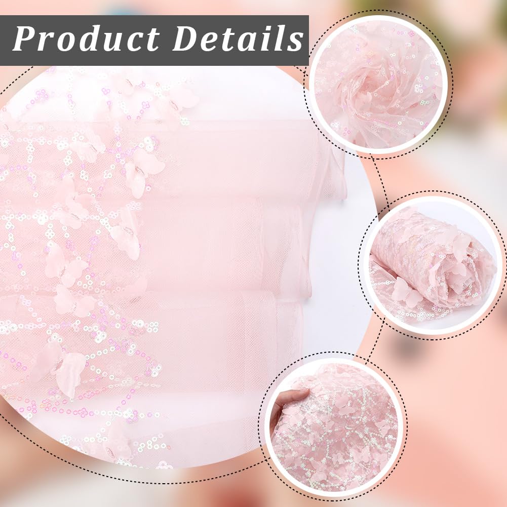 Pink Sequin Mesh Fabric: The 3d butterfly fabric is in a gentle and charming pink hue, covered with delicate sequins that sparkle in the light, adding a touch of romance and softness to your clothing or crafts