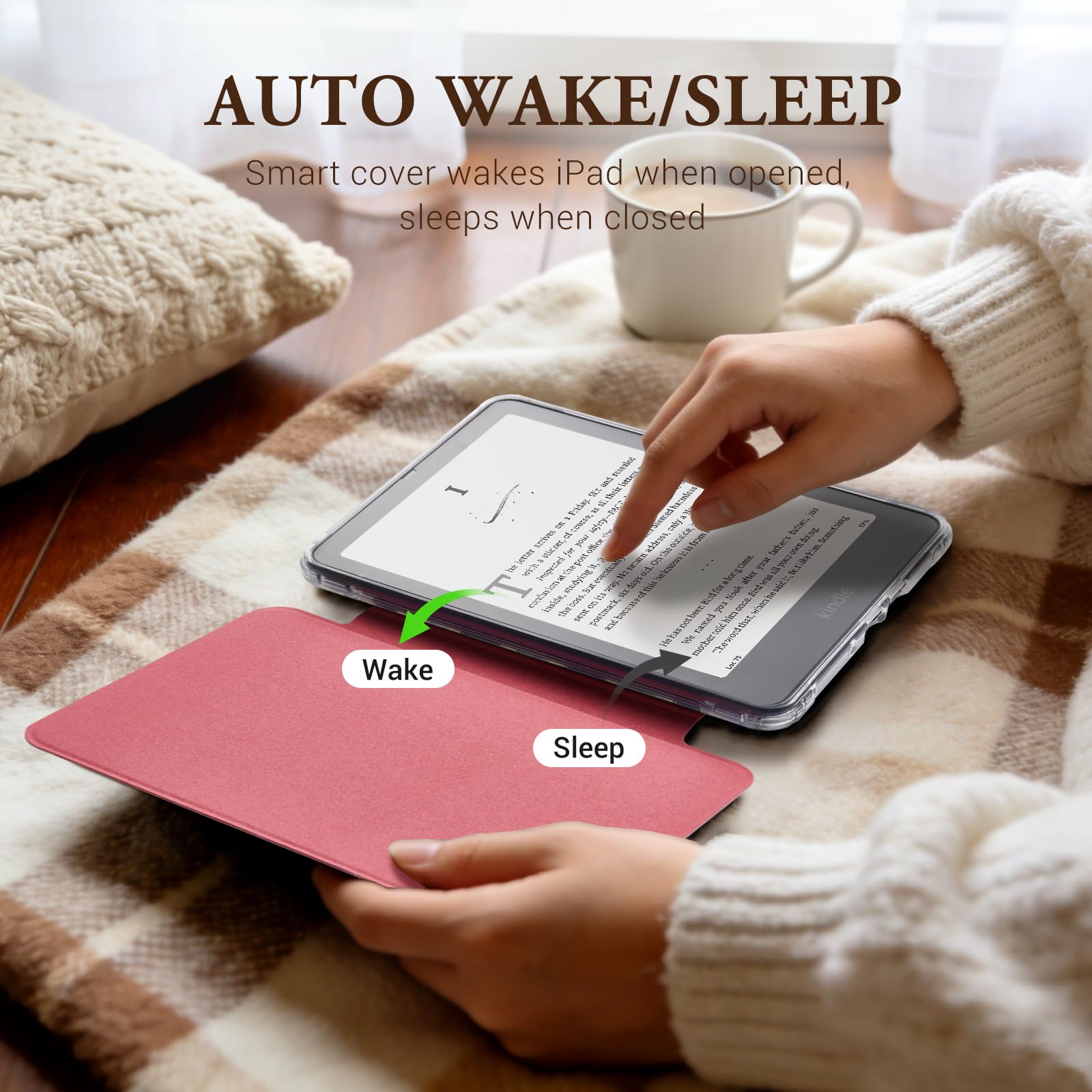 Smart Auto Wake/Sleep Function — The magnetic closure automatically wakes your device when opened and puts it to sleep when closed. This feature extends battery life and ensures your Kindle is always ready for your next reading session.