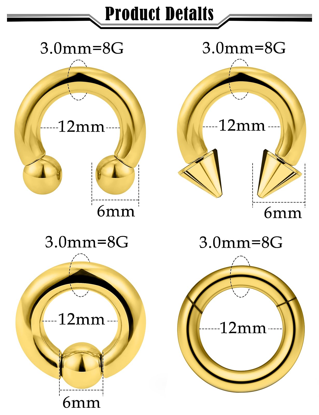 Gauges Earrings Size Specification: 8 Gauge=3mm, Diameter is 1/2"(12mm),Ball Size are 5mm.Hinged Clicker Rings Diameter is 1/2"(12mm)