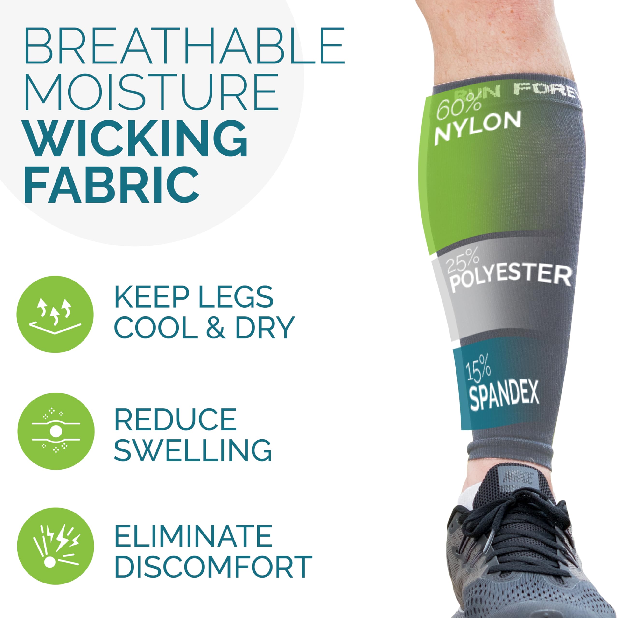 High quality: The leg compression sleeve is made of premium fabric with a combination of 60% Nylon, 25% Polyester & 15% Spandex making it durable, machine washable, breathable & comfortable