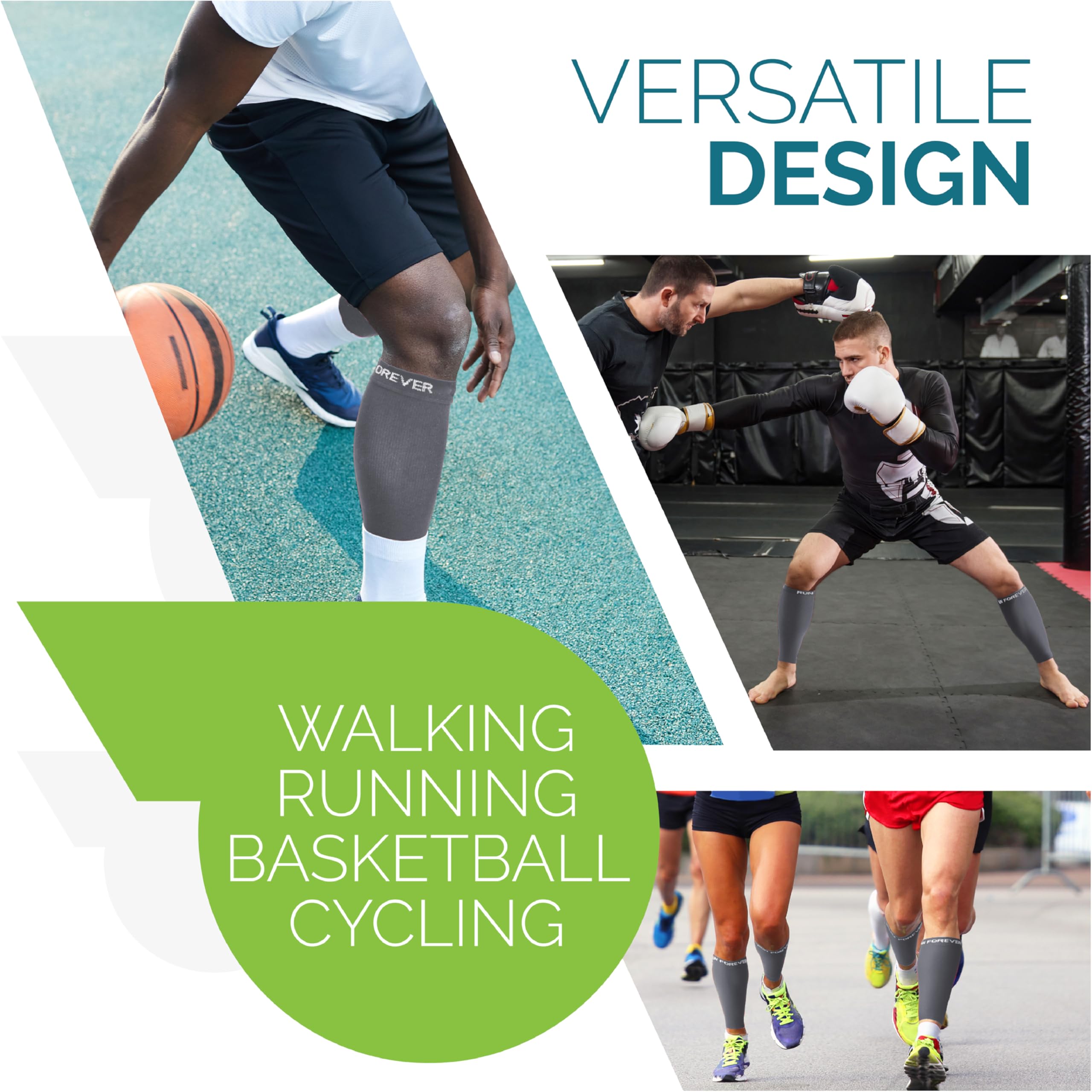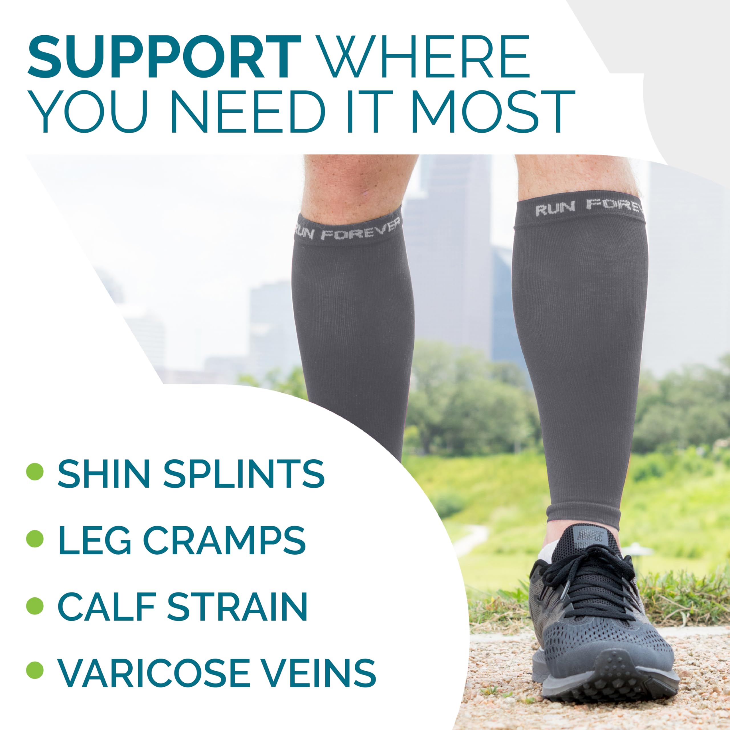 Multiple designs, colors & sizes: Run Forever Sports calf compression sleeve for men & women has many engaging colors and caters to all sizes, from small, to xl, to plus size!