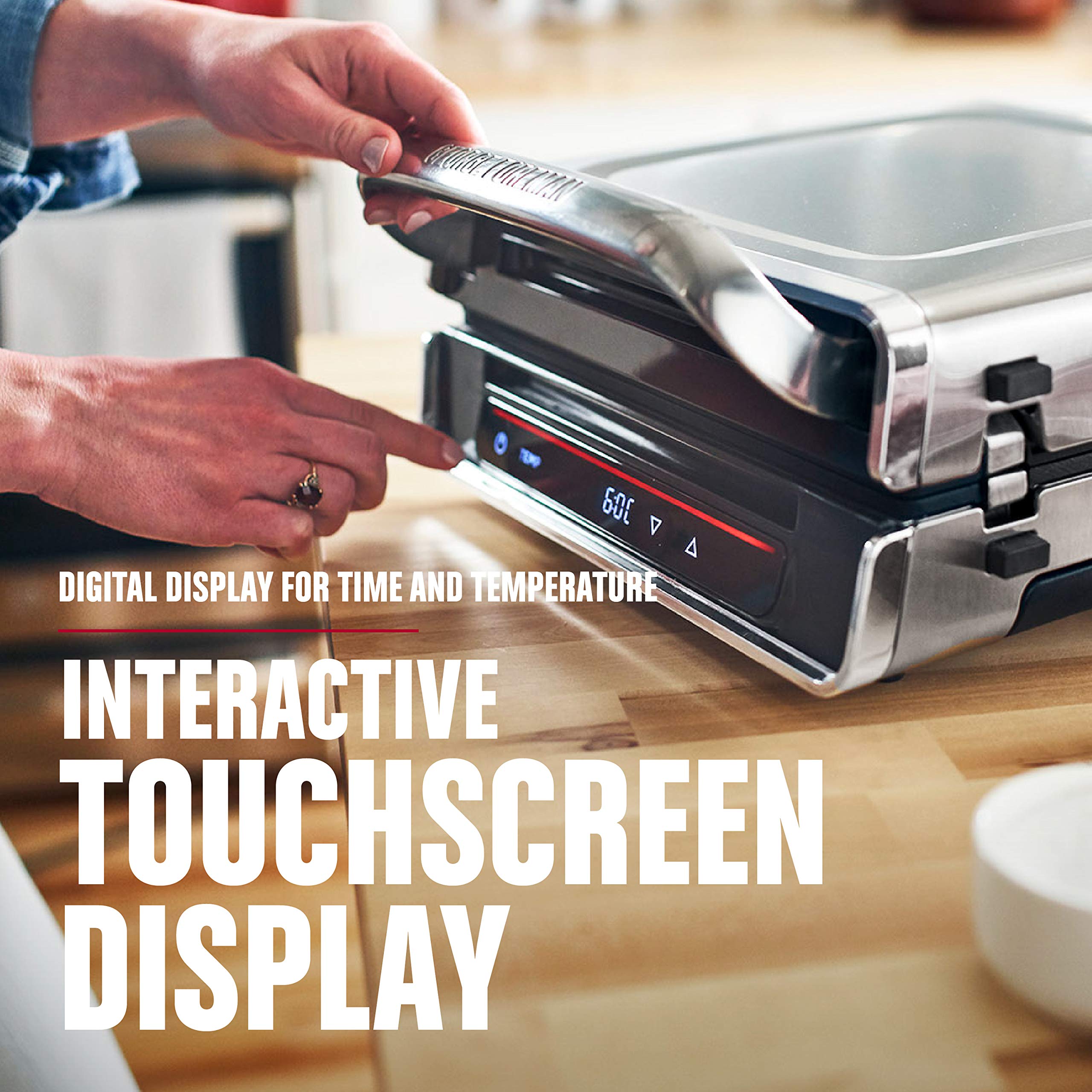 GEORGE FOREMAN® Grills presents: All sizzle without the smoke! The Smokeless - Digital Smart Select Grill makes indoor grilling fast, delicious, and smokeless! The touch-sensitive, digital control panel guides you through the process of selecting the precise time and temperature for every grilling task. With contact grilling, you can cook your favorite meals up to 3X faster**. Give burgers a try—they’re ready in just six minutes***! Plus, the unique open plate design delivers a range of benefits to your kitchen experience: - Reduces smoke by up to 85%* - Cools grease before it can burn - Combines with the sloped grilling surface to remove up to 50% of fat^ - Drains grease into the dishwasher-safe drip tray for easy disposal - Removable, dishwasher-safe plates with Advanced George Tough™ Nonstick Coating *than George Foreman model RPGD3994 when grilling ¼ lb beef burgers (20% fat, 80% lean) with a clean grill and drip try **¼ lb 80/20 ground beef to 160°F vs. the Power Smokeless Grill™ PG1500 with the lid off ***Cooking two ¼ lb 80/20 ground beef patties to 160°F on preheated grill ^from ¼ lb uncooked 80/20 ground chuck ^^Compared to standard George Tough™ nonstick coating