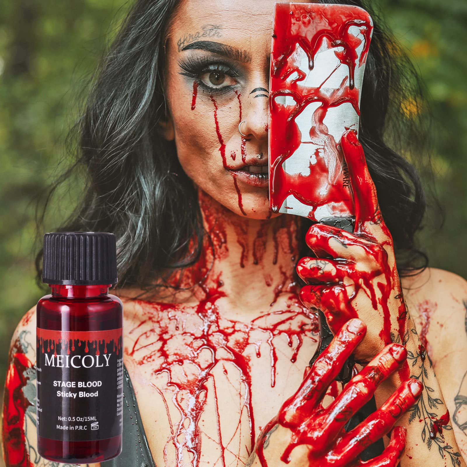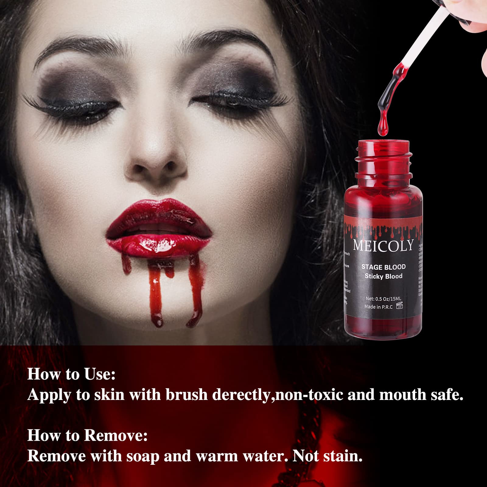 SPECIAL EFFECTS MAKEUP:Our edible fake blood will stays put.Fake blood fit for Halloween,action,horror film,stage FX,cosplay,clothes,zombie,scary clown,demonic character.Add MEICOLY realistic fake blood stage blood that finishing touch to scar tissue, rotting flesh,open wound effects