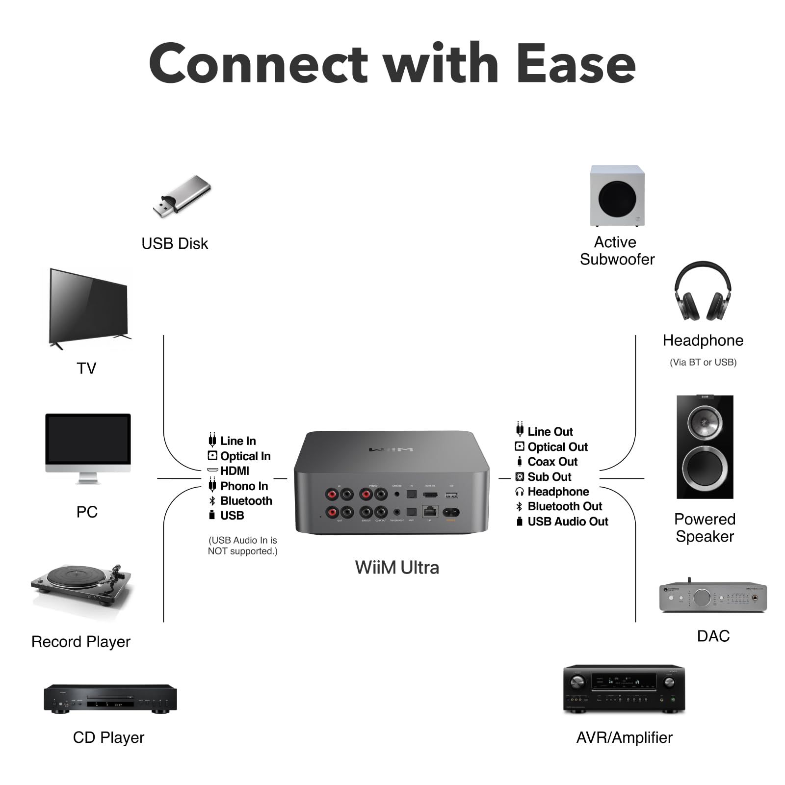 Versatile Connectivity Options: The WiiM Ultra offers versatile audio integration with its wide array of connection options. It features USB, Optical, Coaxial, RCA, a dedicated headphone output; HDMI ARC, and inputs for RCA, Phono, and Optical. It seamlessly integrates with both digital and analog sources, offering unparalleled flexibility for any audio setup.