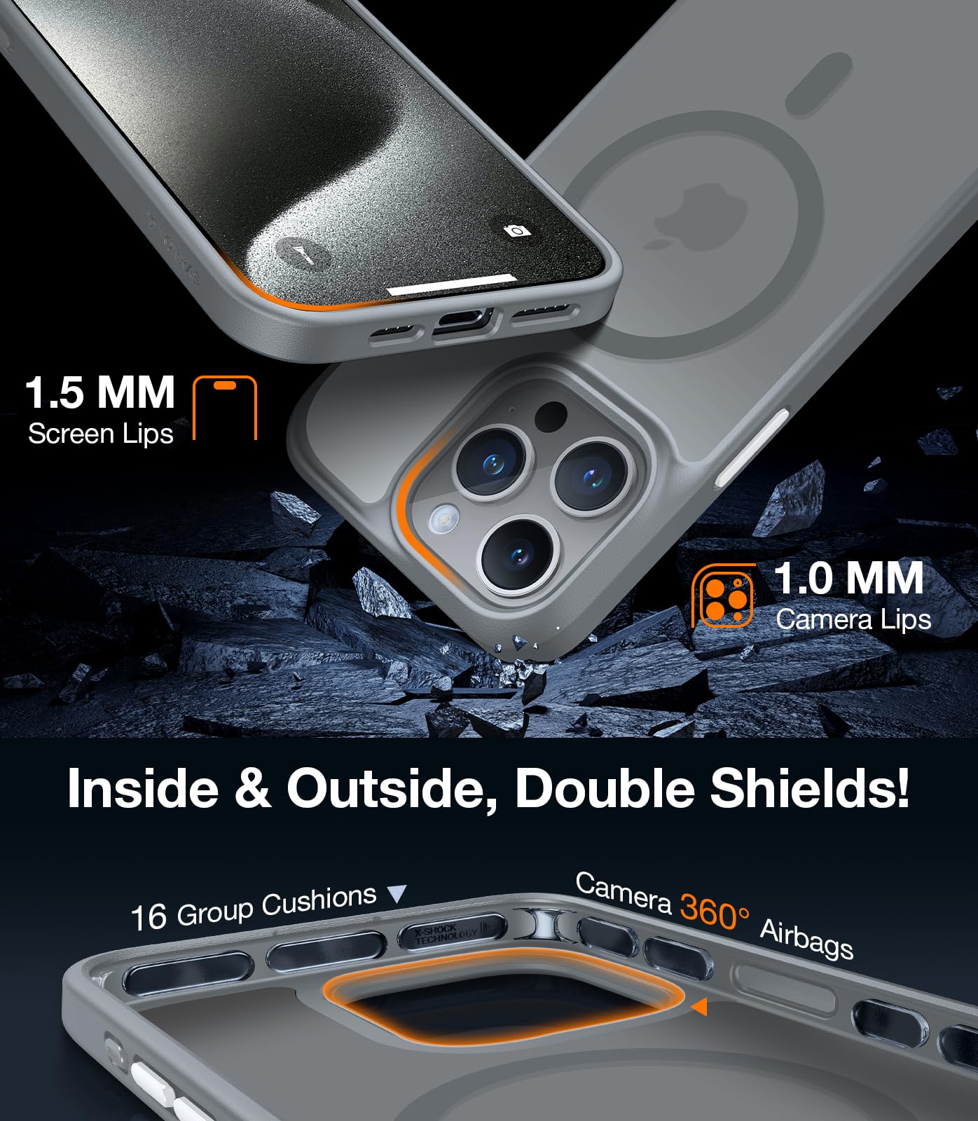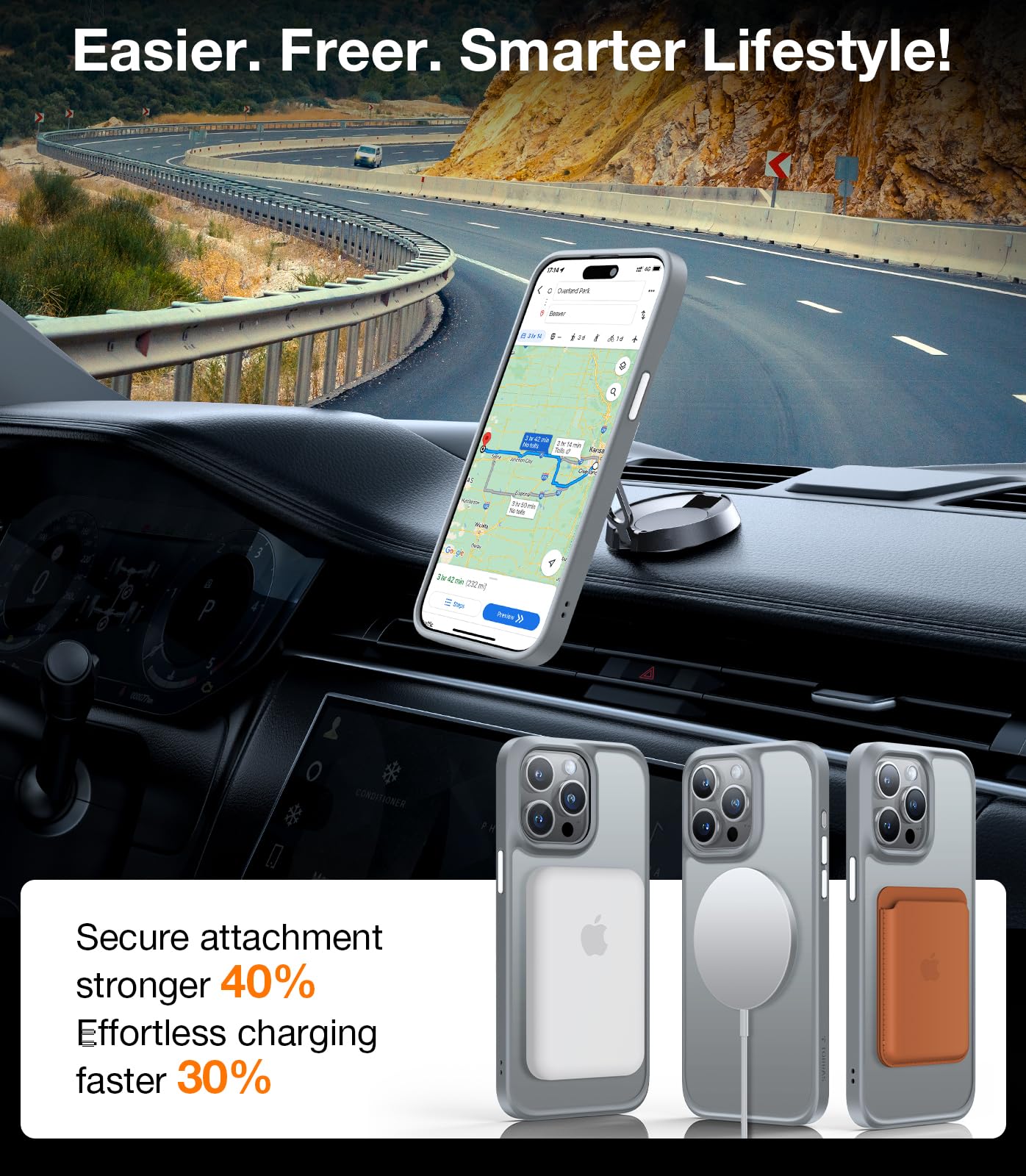 [Powerful Magneticfor Stability & Durability] Compatible for iPhone 15 pro phone case is 40% stronger magnetic than the official mag case, thanks to over 38 N52 neodymium permanent magnets. Advanced Halbach structure delivers a magical attach experience and faster wireless charging in an instant. Powerful suction keeps your phone stable even when driving on a bumpy road