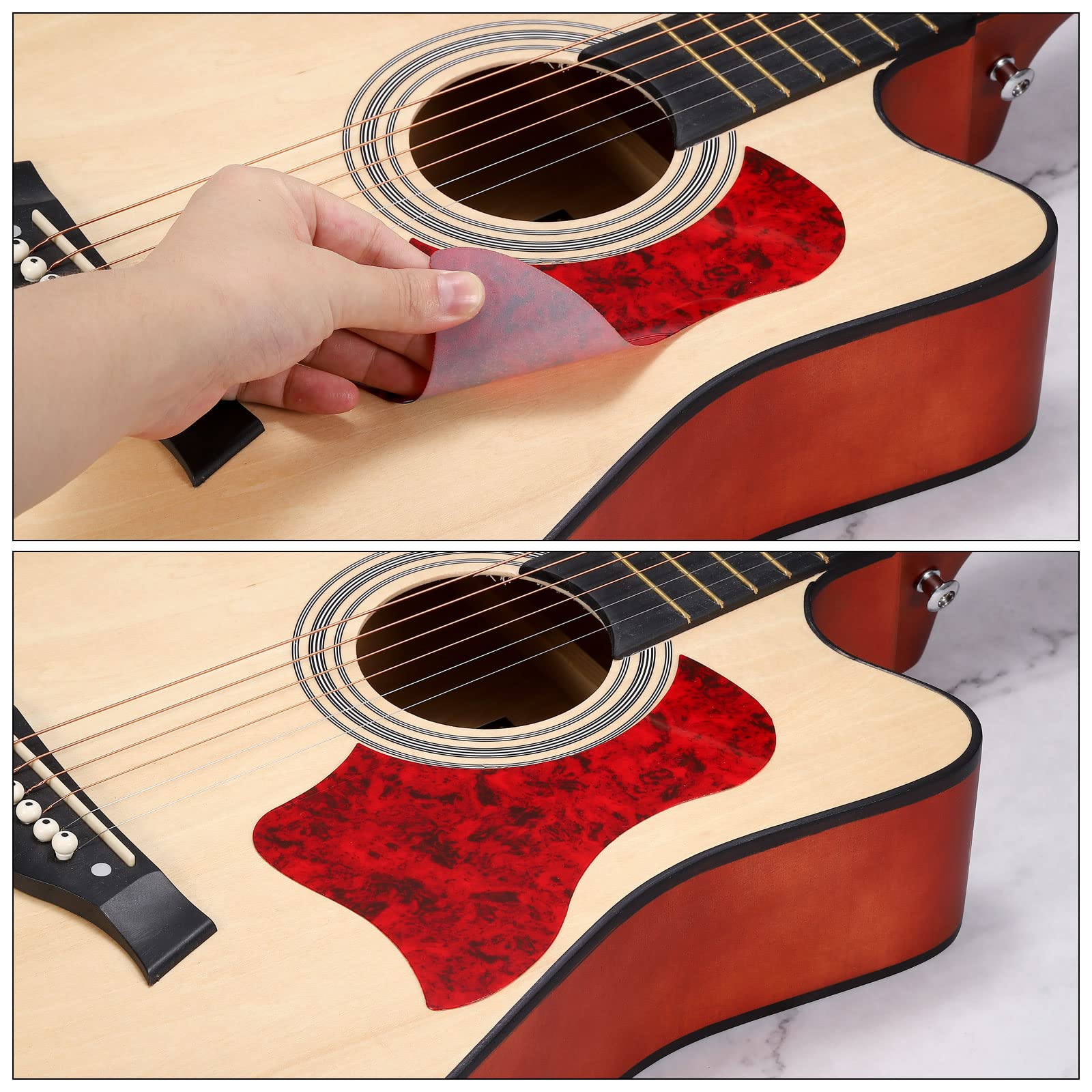 What is this? It is mainly used to protect the surface of the guitar. You don't have to worry about scratching the surface of the guitar when playing. It protects the guitar and adds an interesting and beautiful decoration to the guitar. Widely used in acoustic guitar, electric guitar What will I get? The acoustic guitar Pickguard, we provide here, are in the size of: Material: Plastic Color: Red,Yellow Size: 101*174*0.6 / 3.98 x 6.85 x 0.02 inch (W*L*T) In the package of: 2 Pack x Acoustic guitar Pickguard Is there any advantages of the product? Made from PVC, it is the perfect replacement Pickguard for acoustic guitars, a professional guitar protection board, that protects the surface of the guitar without affecting the sound. How to use it? Tear off the self-adhesive and stick it on the guitar What should I notice? All size above is measured by manual, please allow +/-0.1 inch error.