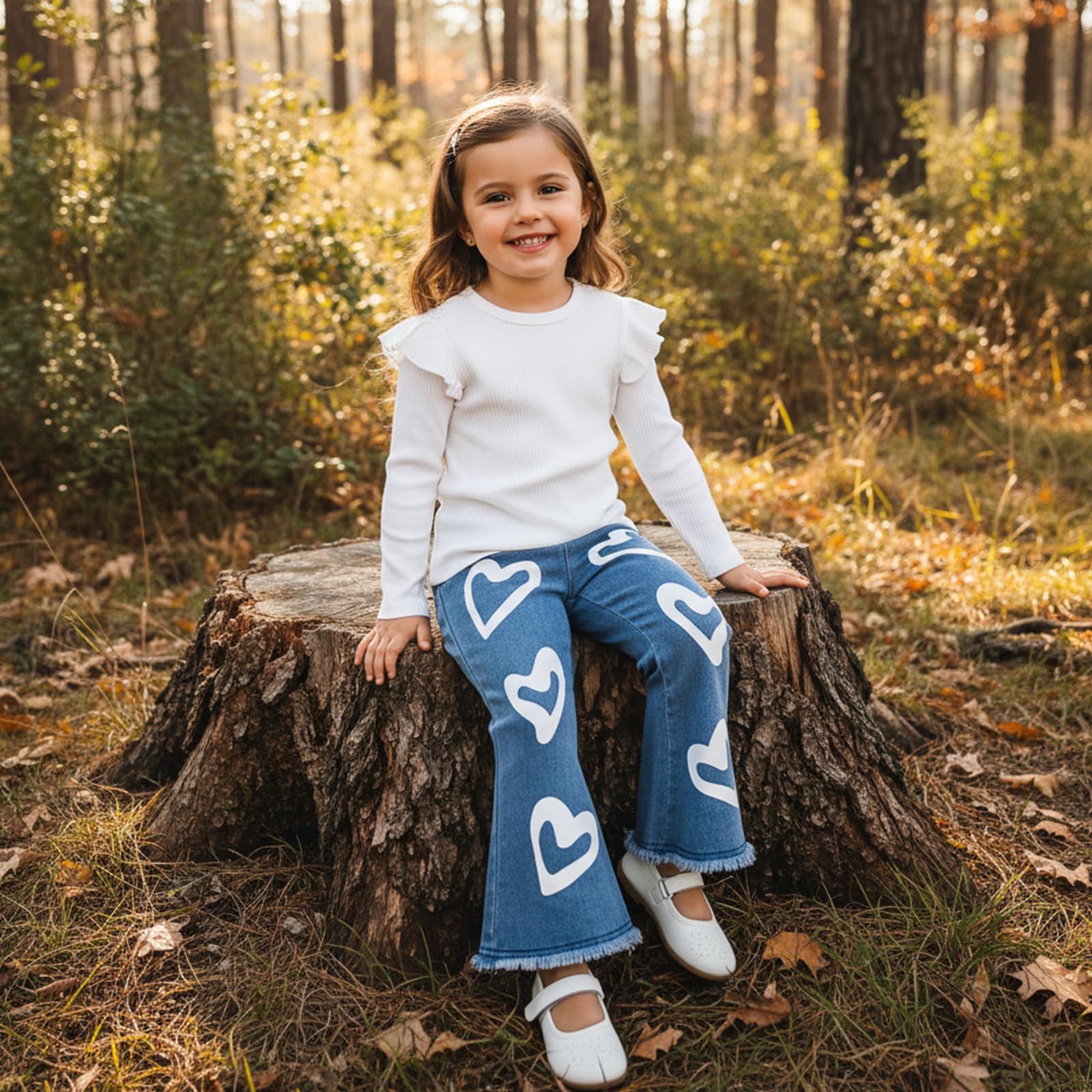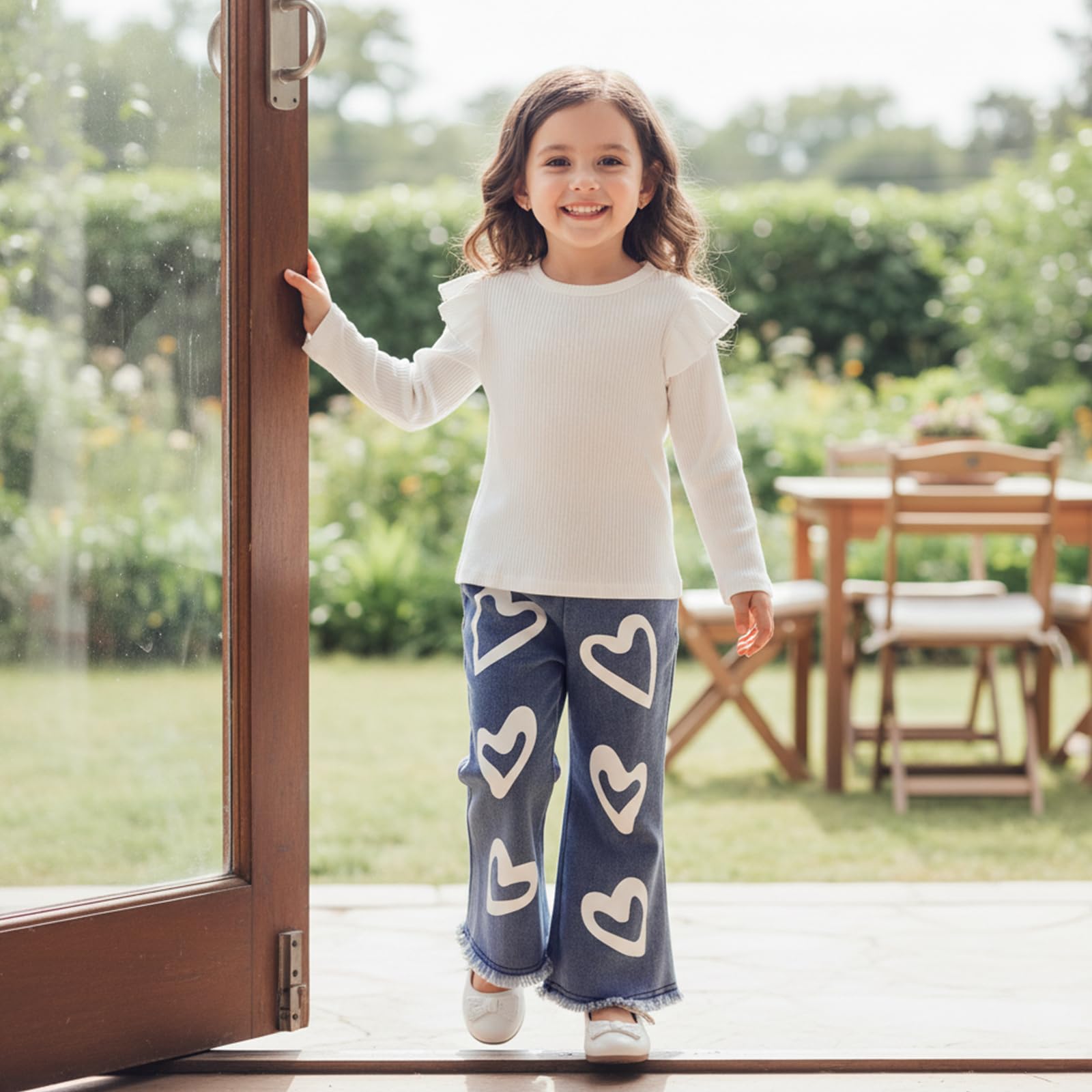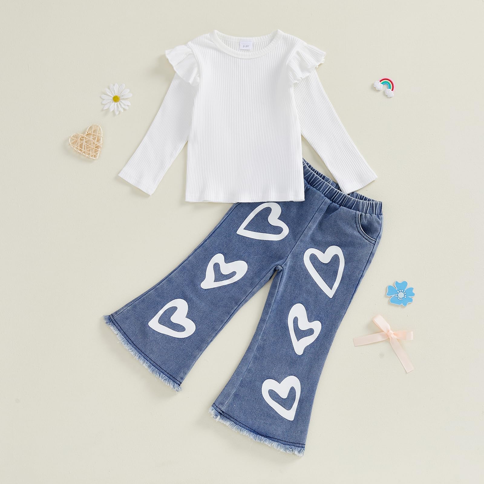 DESIGN: Toddler valentine's day outfits for girls, girls tops use solid color, ribbed, crew neck,Ruffle long sleeve design, matches heart print bell-bottom jeans, chic and stylish.Our cotton blend soft baby girl sweatshirts and pants are crafted to be extra soft and comfy,built to last season after season