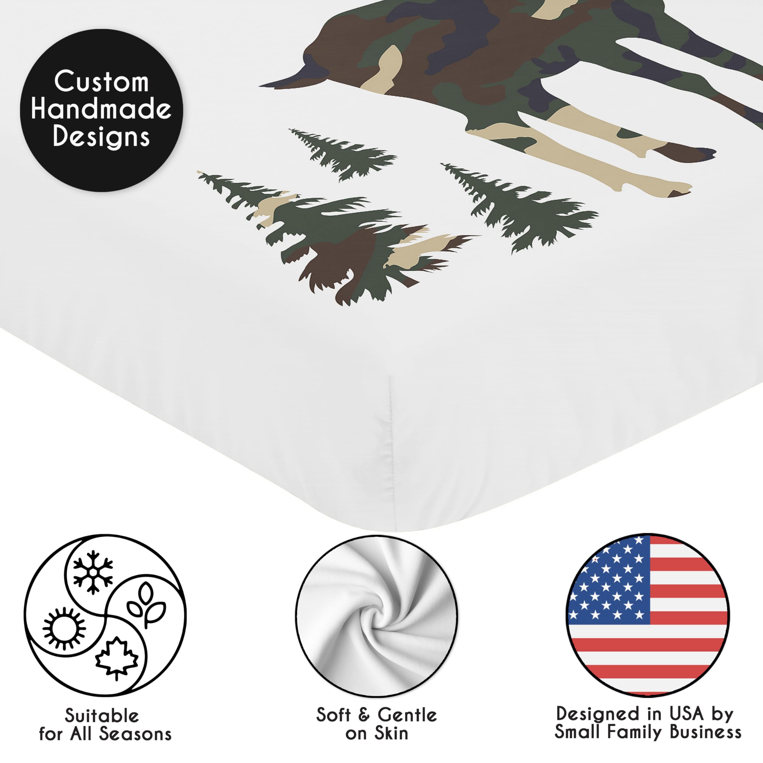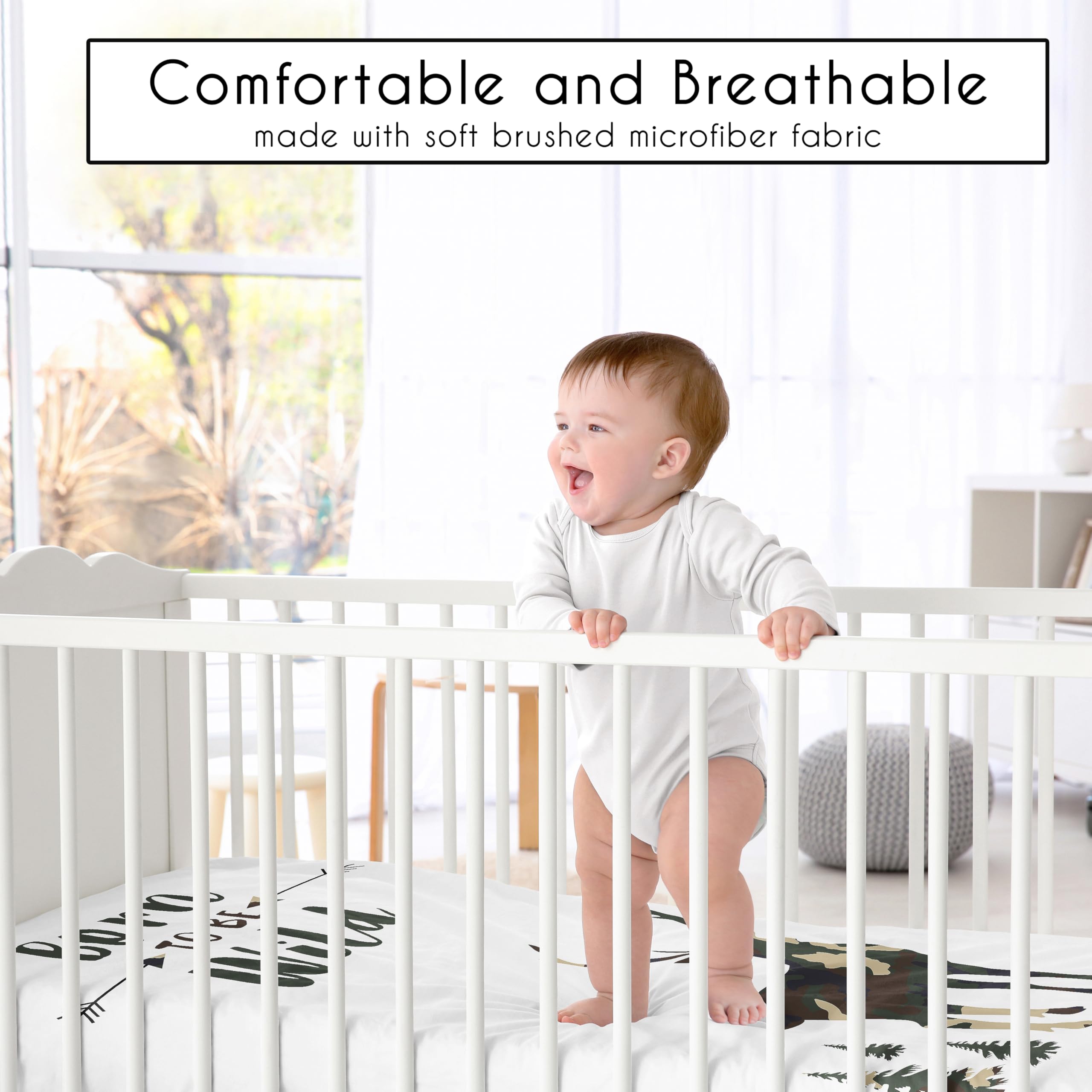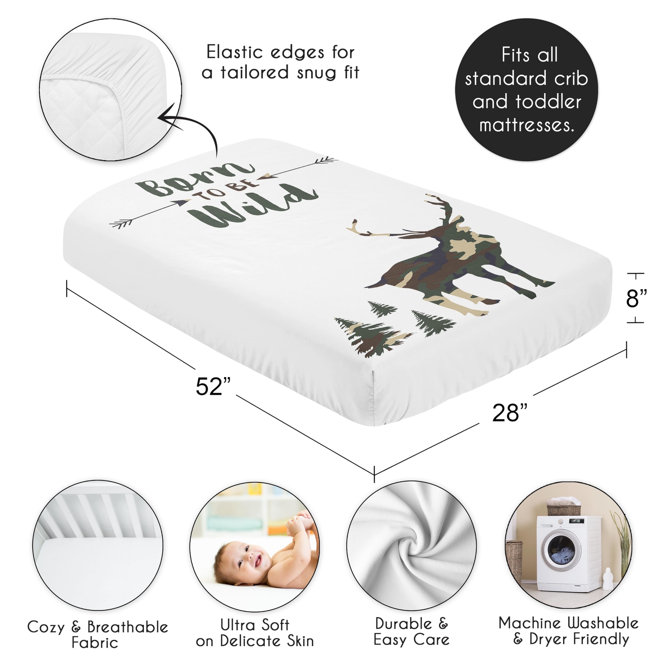 SNUG FIT: Includes (1) Fitted Crib Sheet 52in. x 28in. x 8in. Our newborn standard crib sheets fit snugly, with premium elastic sewn around the entire bottom edge for a secure fit on most standard sized cribs and toddler beds, to reduce shifting and bunching. This brushed microfiber crib sheet features an exclusive design of a hunter green, black & beige forest, trees, classic, wilderness, "Born to be Wild" Woodland Camo print & is gentle on delicate skin to foster a soothing sleep environment.