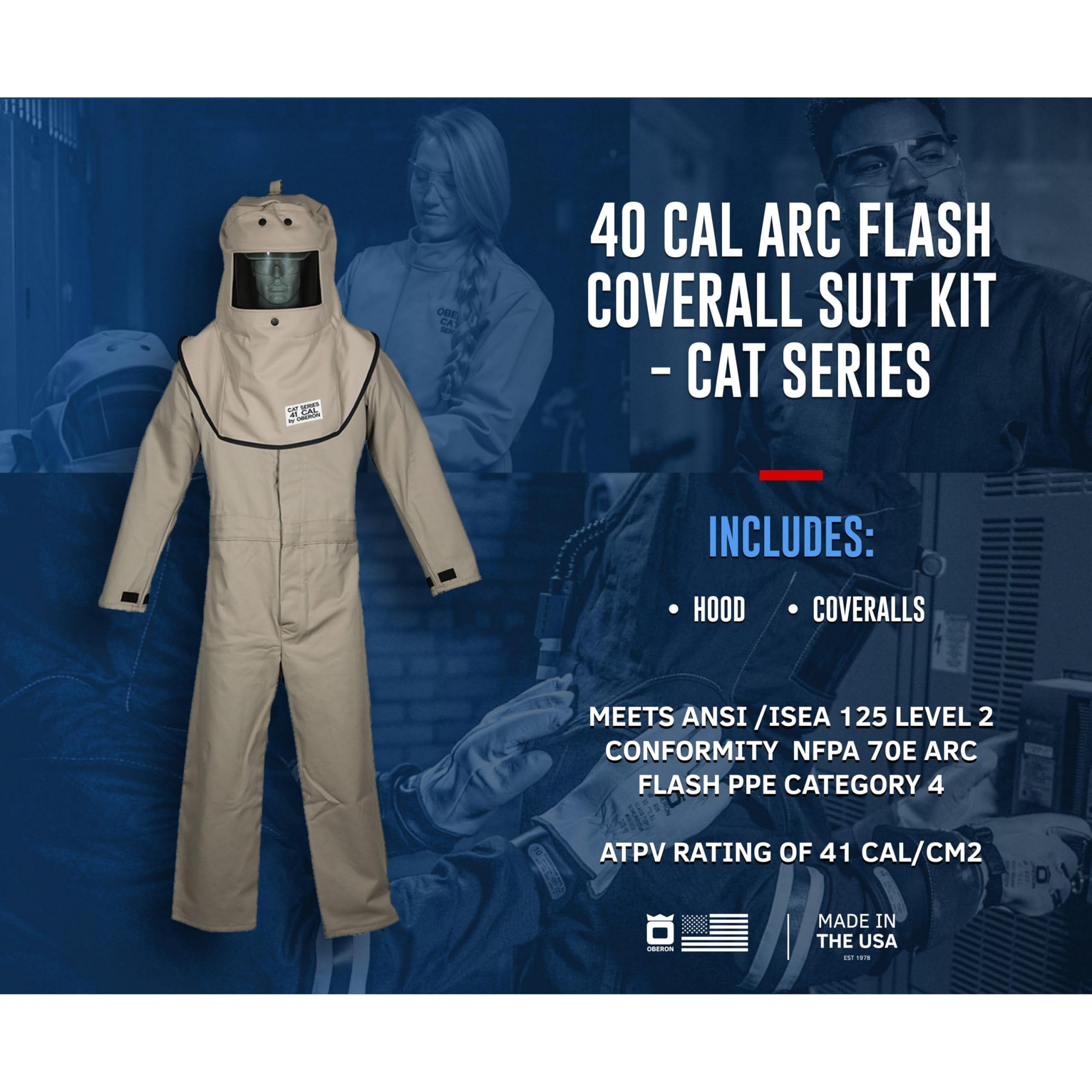 CAT4™ Series arc flash suit sets meet and exceed NFPA 70E PPE Category 4 standards and have an ATPV rating of 41 cal/cm2.