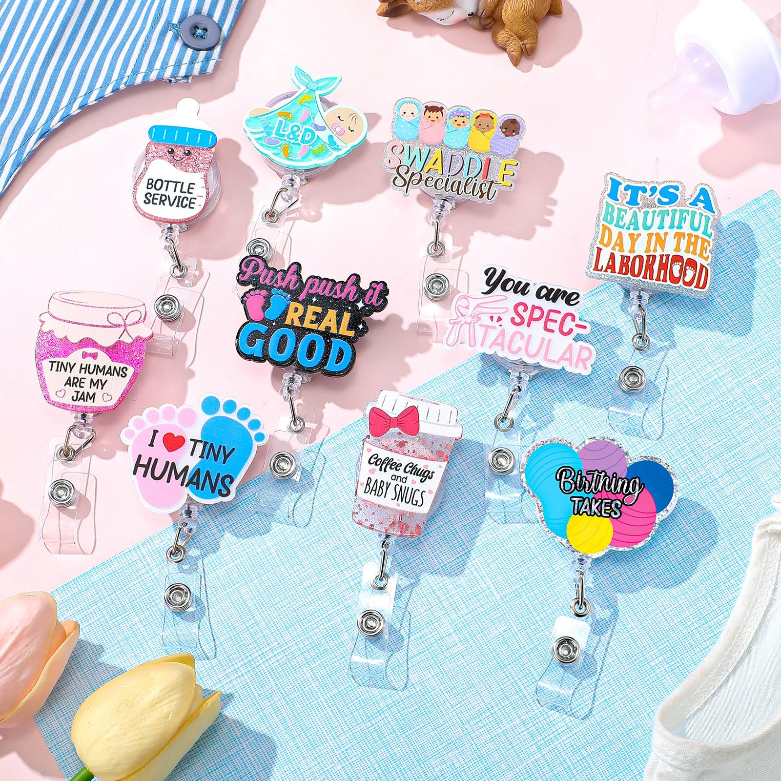Fashionable Parade with Variety of Fun Designs: add a dash of glitter to your style tools with our labor and delivery nurse badge reels, coming in 10 kinds of fun filled designs to elevate your style; Their colors and captivating looks are sure to make them the star of your wardrobe