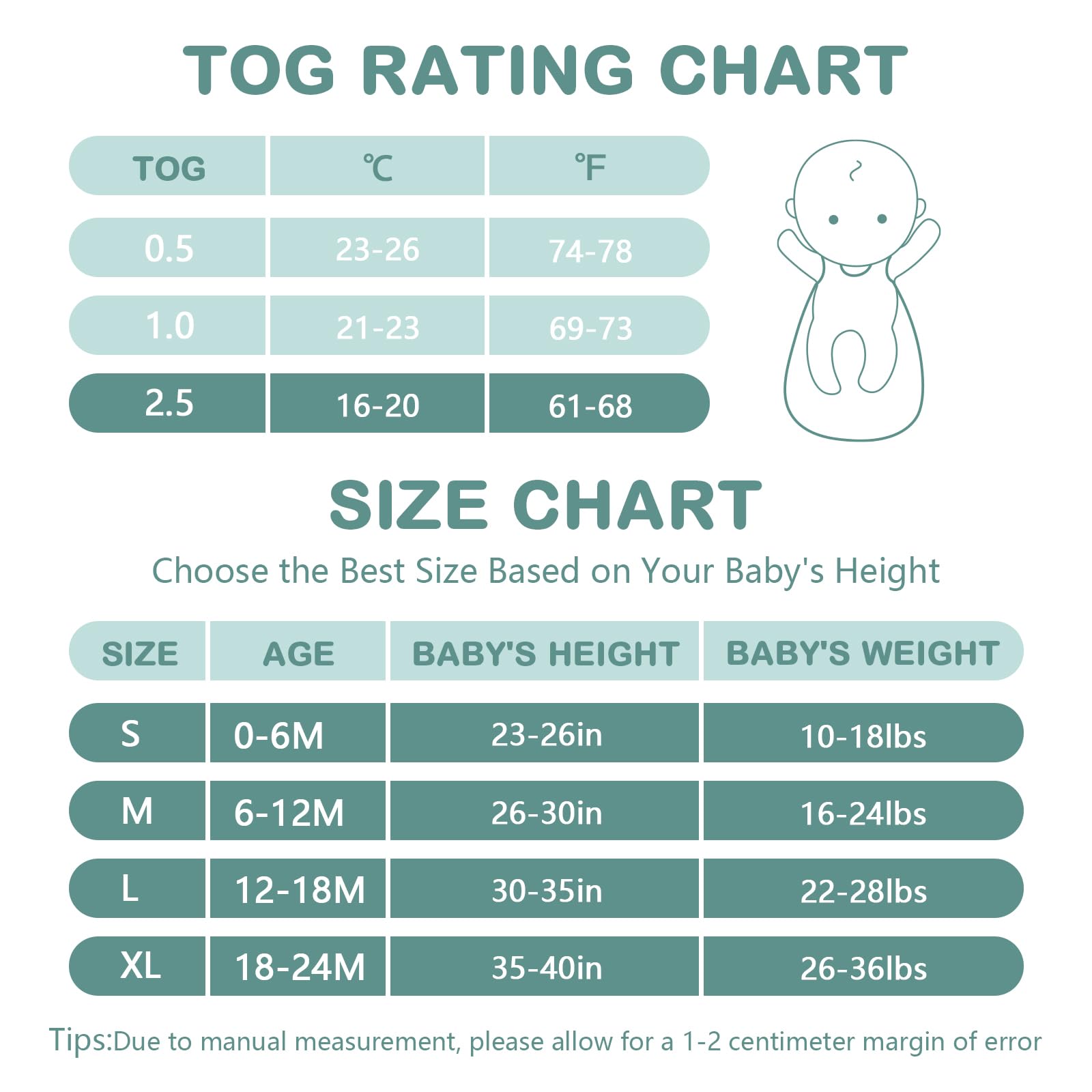 【2.5 TOG Winter Sleep Sack】This is a very warm 2.5 Tog Winter Model baby sleep sack for room temperatures below 70 °F.The recommended nursery temperatures should be between 58°F to 69°F. A Baby Sleep sack surrounds the baby, providing insulation from both below and above, and also a warm pocket of air around the baby.