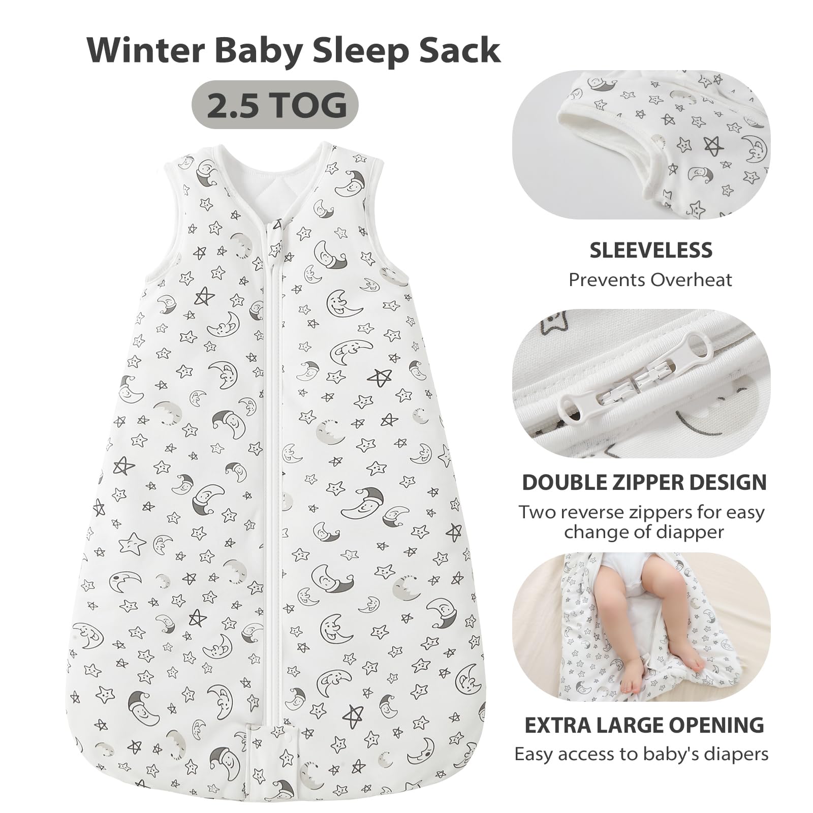 【SMOOTH 2-WAY ZIPPER】 Unzips from the Top, which makes it easy to place baby in sack. Unzips from the Bottom, which makes it convenient for diaper changing. With zipper protectors on the back and at the end, protects baby from scratches
