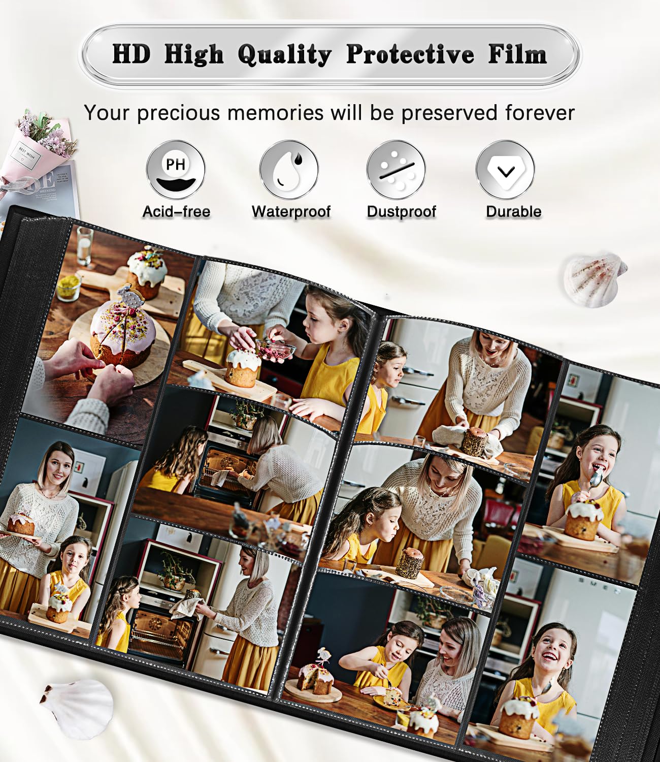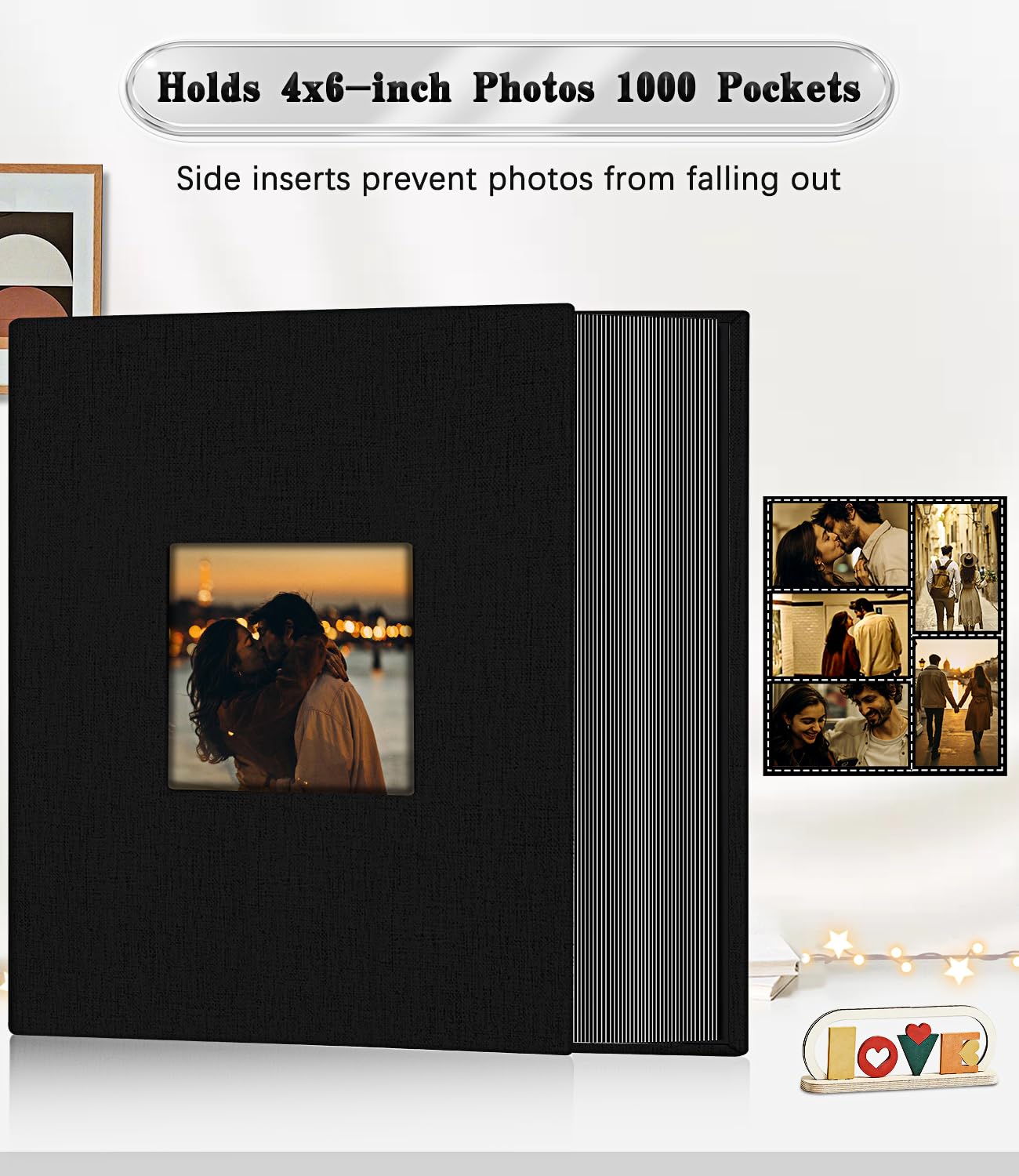 💖 Perfect Storage Capacity: This hardcover photo book is 13.2 L x 12.4 W x 2.8 Thick (inches) with 100 sheets/200 pages. Each page has 5 pockets that hold a total of 1000 4x6 photos.Photos fit snugly in the pockets and won't slip out. Perfect for storing your family, wedding, anniversary, baby and holiday photos, so you can organise and display your photos beautifully and conveniently.