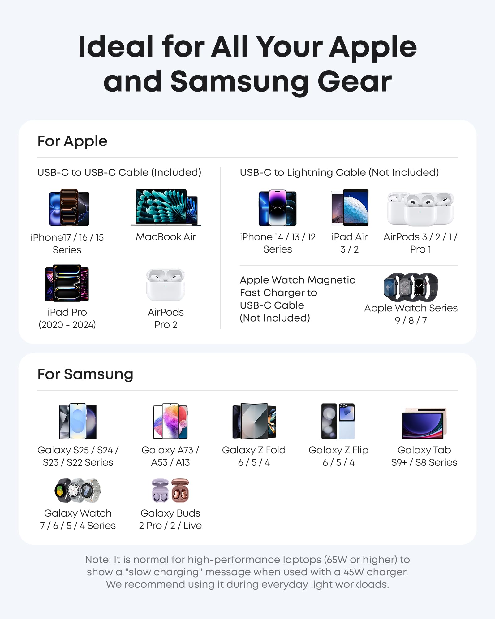 Universal Charging: Supports a wide range of devices, including Apple and Samsung, providing a reliable power source for all your charging needs.
