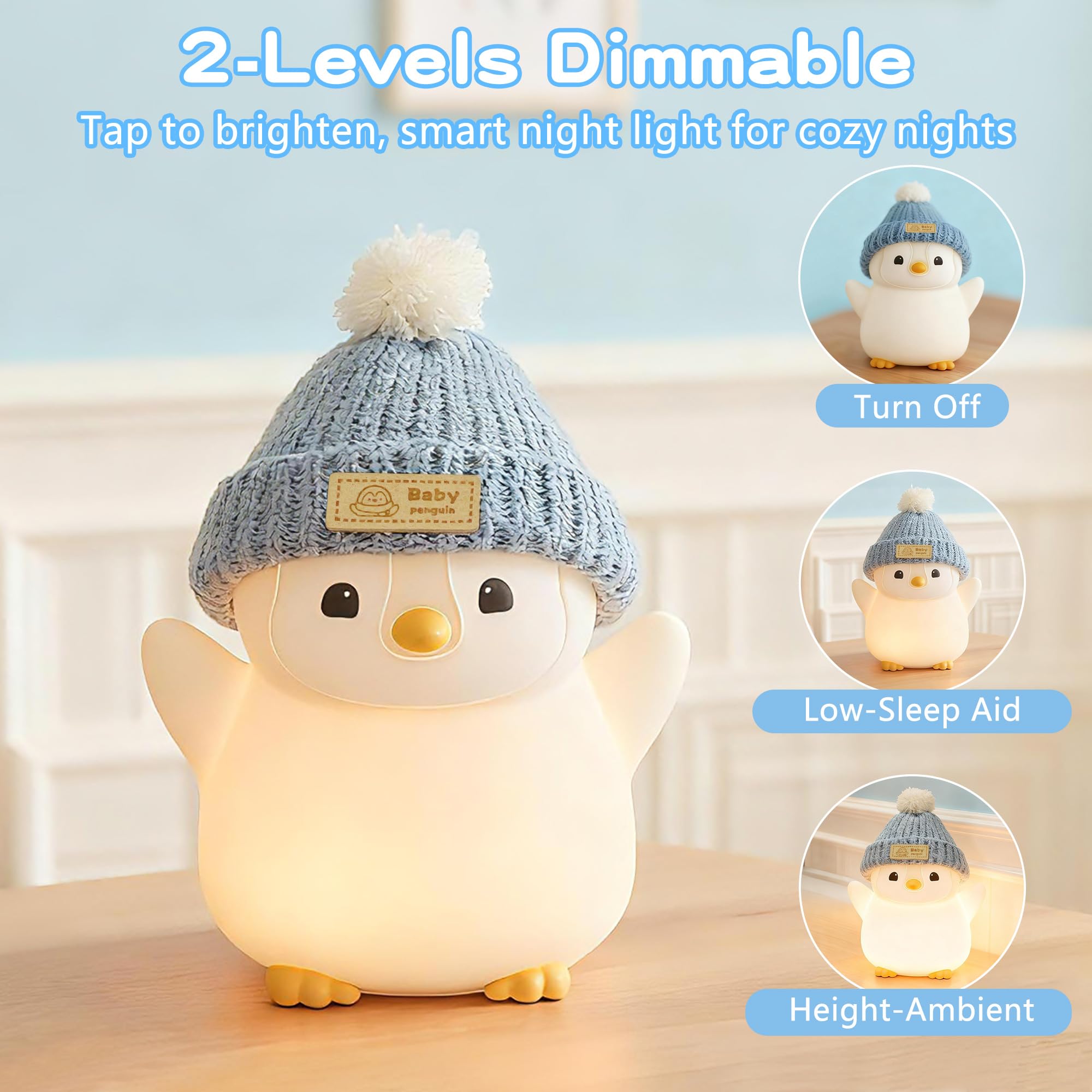Gentle Touch/Tap Control & 2 Levels Brightness Adjustable: This penguin dimmable night light with knit hat experience intuitive operation! A simple tap on the penguinβs head turns it on/off, while adjusts brightness from 10% to 100%βperfect for late-night feeds or bedtime stories. The 3000K warm white light protects kidsβ eyes from harsh glare, aligning with baby room decor needs for a soothing ambiance. fun stuff touch lamps for nightstand