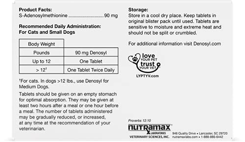 Denosyl has been shown to markedly increase liver levels of glutathione,1,2 an important compound for liver health formed when SAMe (S-Adenosylmethionine) is metabolized. Denosyl has also been shown to help protect liver cells from cell death3,4 and may help cell repair and regeneration. While best known for supporting the liver in cats, Denosyl also has a place in supporting brain health. Denosyl could help your best friend live a longer, healthier life. 3 pack is economic and great for multi pet households.