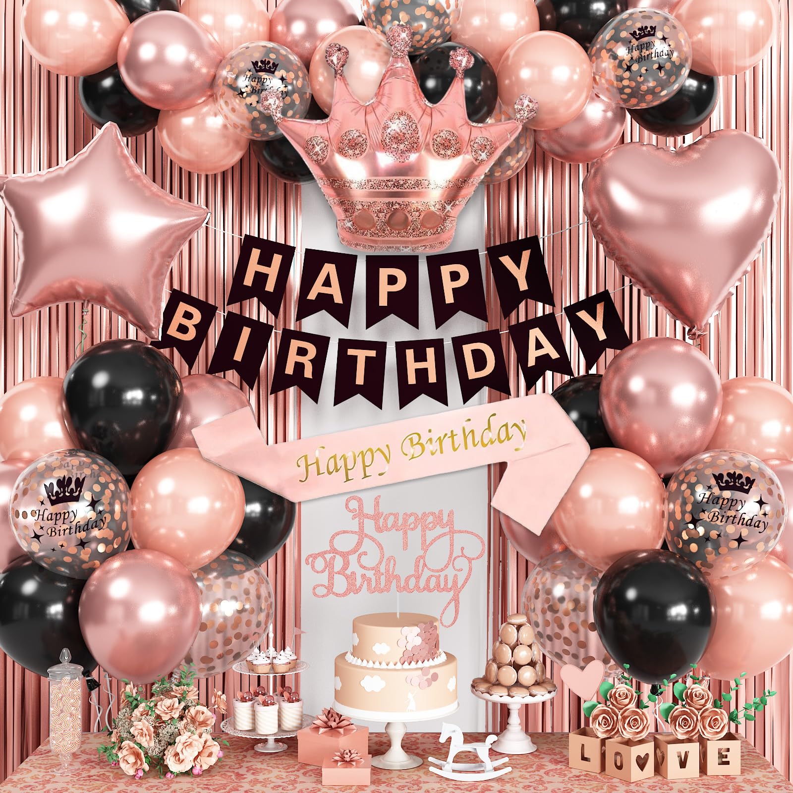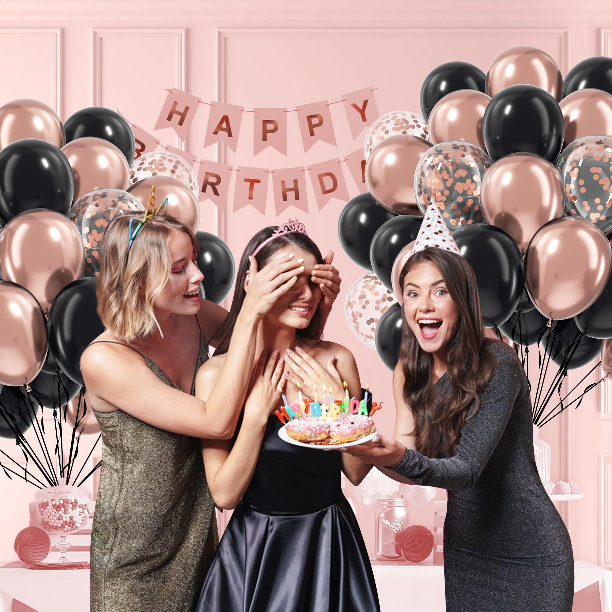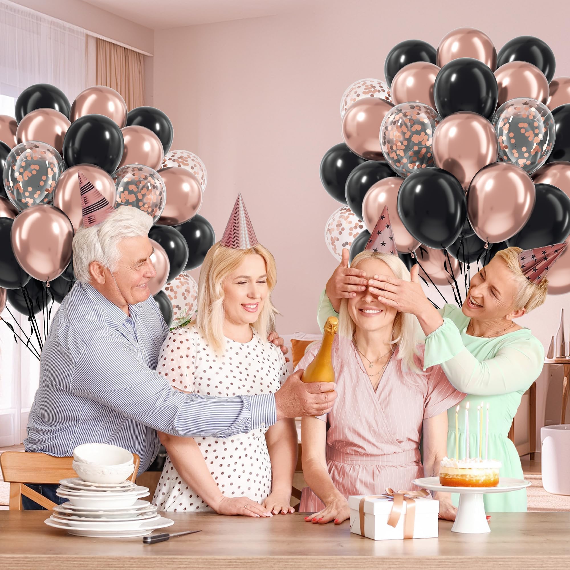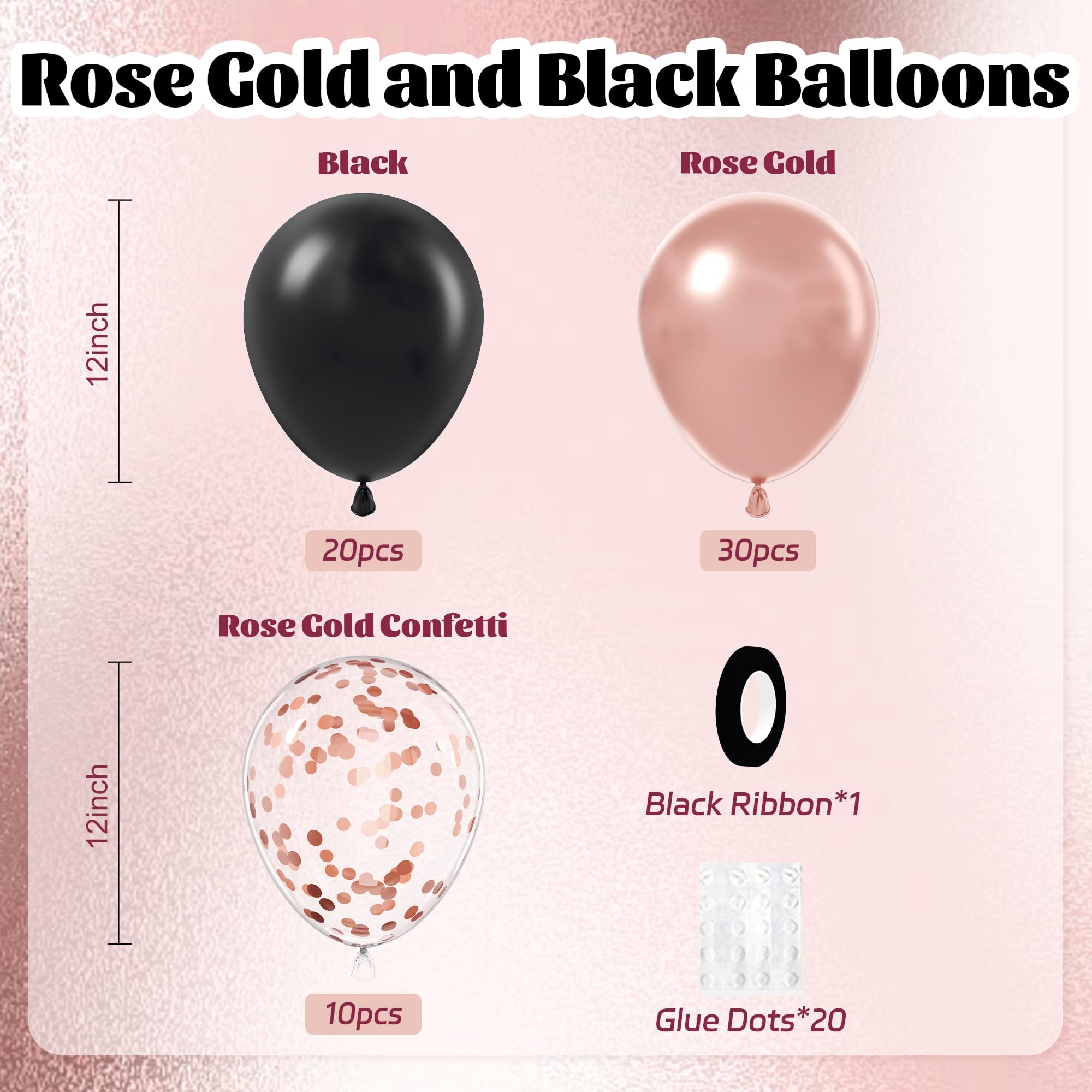 Package Include: The rose gold and black balloons included 12inch black balloonsx20, 12inch rose gold balloonsx30, 12inch rose gold confetti balloonsx10, glue dotsx20, black ribbonx1