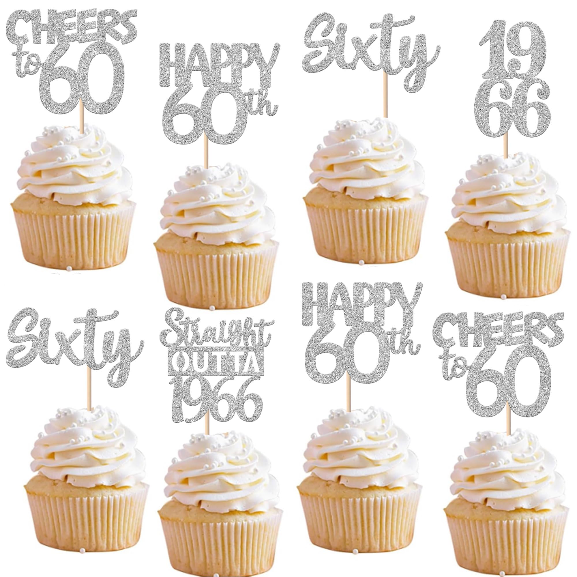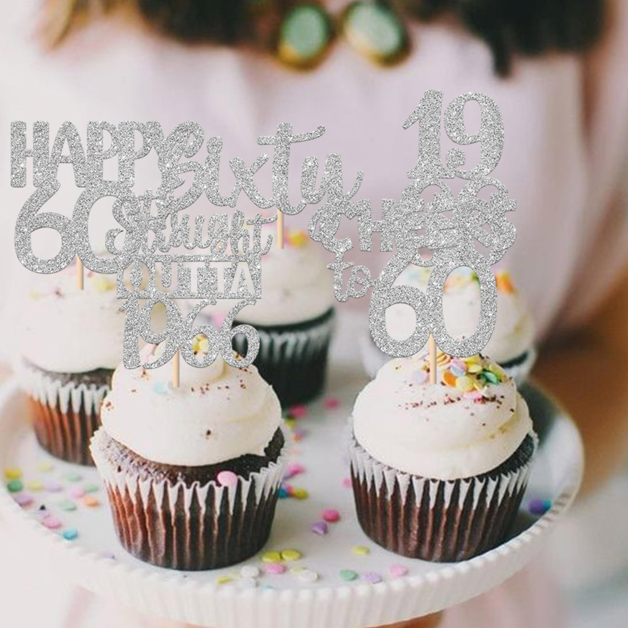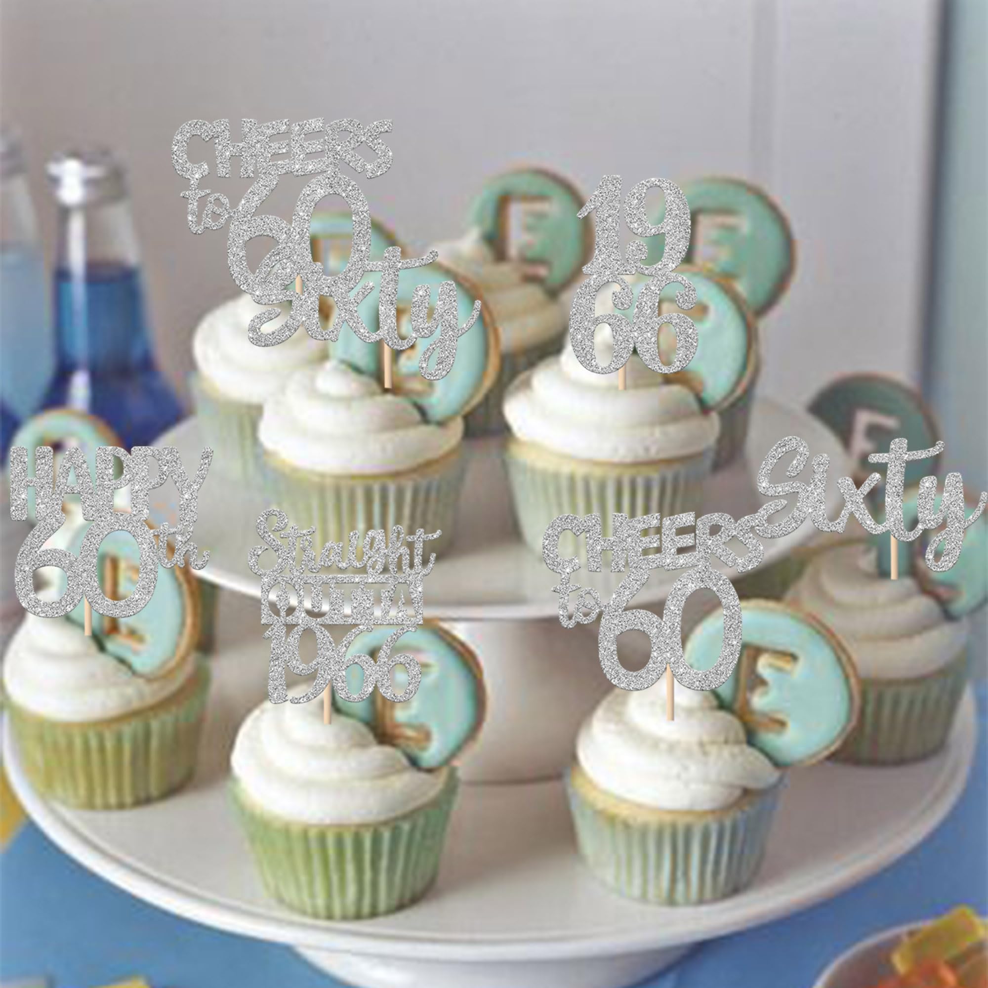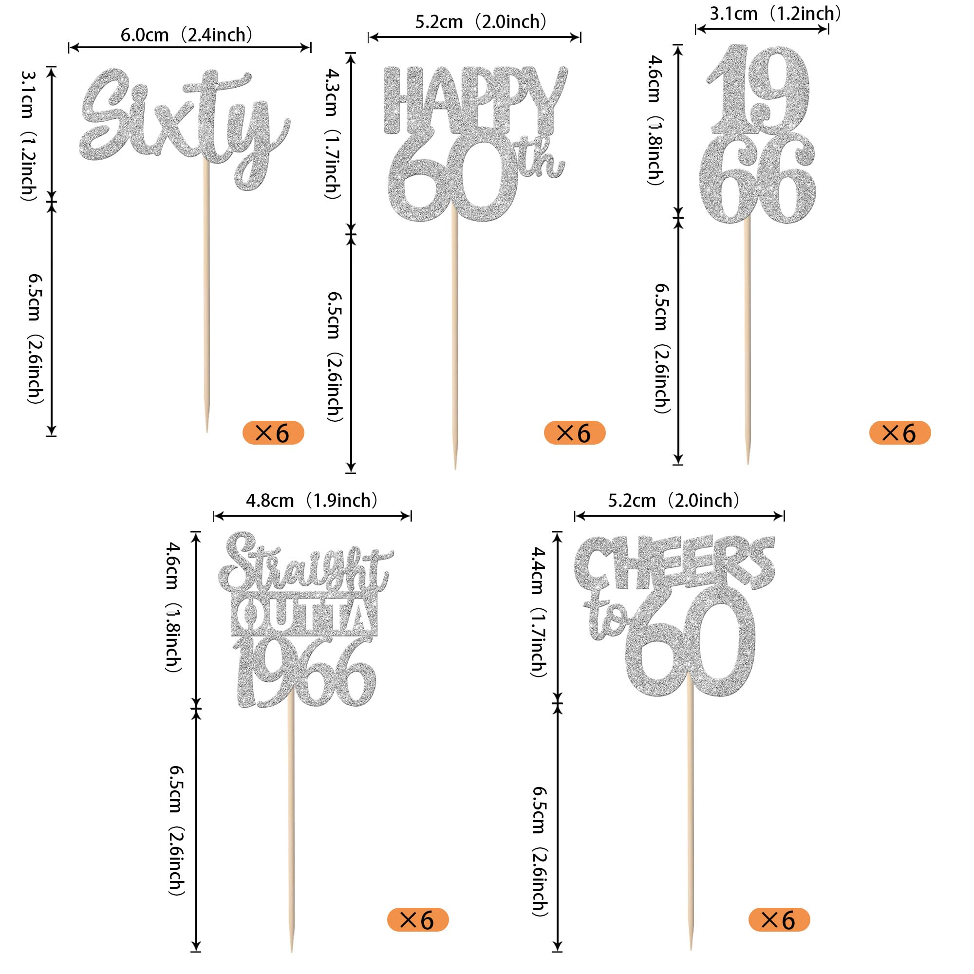 Straight Outta 1966 Cupcake Toppers for Happy 60th Birthday Anniversary Party Cake Decorations Supplies Perfect for happy 60th bithday theme party,straight outta 1966 theme party,60th wedding anniversary theme party,cheers to 60 years theme party cupcake decorations supplies. Pack of 30 pcs,6 pcs of each design The size is 1.9*4.6 inch / 1.3*3.9 inch / 2.1*4.6 inch / 2.3*3.9 inch / 2.2*4.5 inch ( with stick ) Made of high quality paper card stock ,thick and thick and sturdy. These cupcake toppers are single glitter, the back is white, and they are intended for decoration only, please do not put them in oven or microwave. If the item you received has any defects, please contact us.we will deal with it within 24 hours.