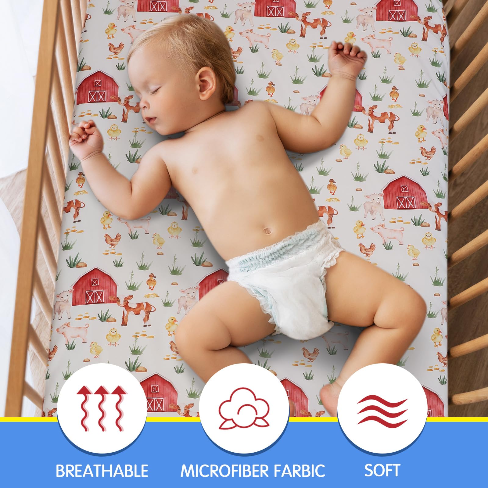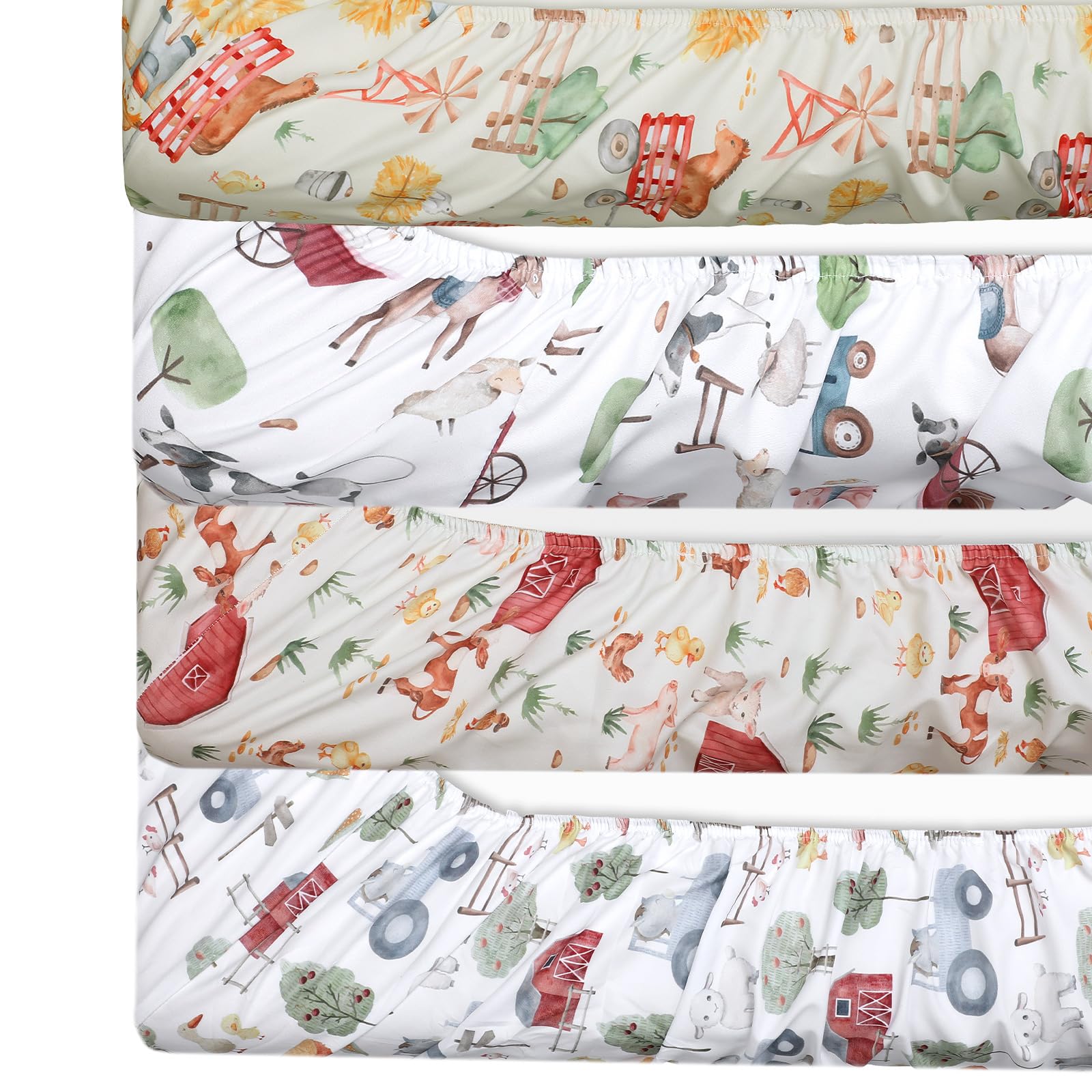 Versatile Set in Classic Colors: enjoy a convenient and versatile 4 piece set of farm animals crib sheets suitable for your baby's nap time or bedtime; The set comes in a classic color that easily fits into various nursery themes, representing a reliable choice for parents who want to provide a comfortable experience for their babies and style in one package