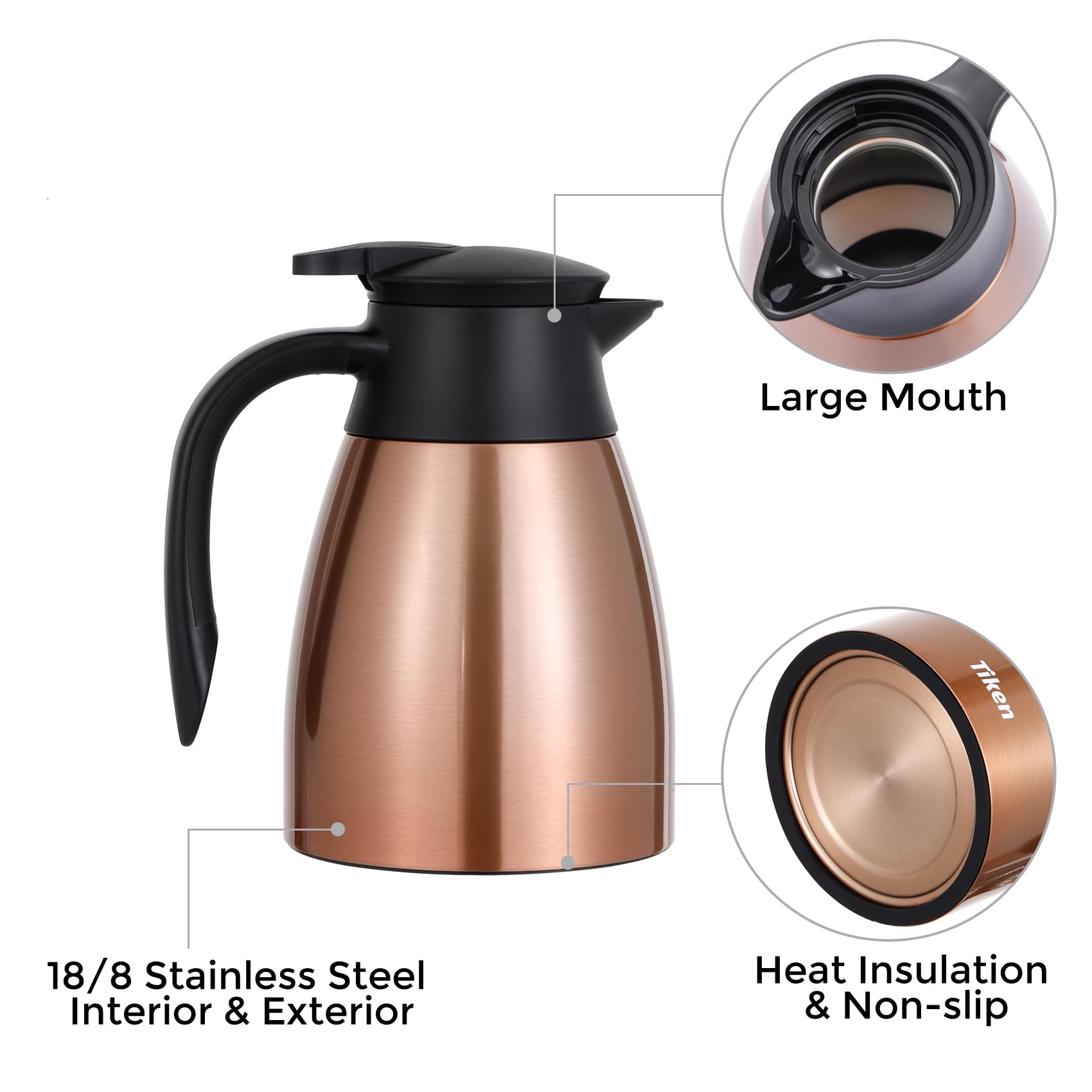 Groove spout and inner dual silicon rings are available, which avoid leaking when pouring water. Our leak-proof lid is designed with a new insulated and air-tight construction, always locks in the correct place when closing. Even with a slight tilt, the thermal carafe pitcher will not leak one single drip.