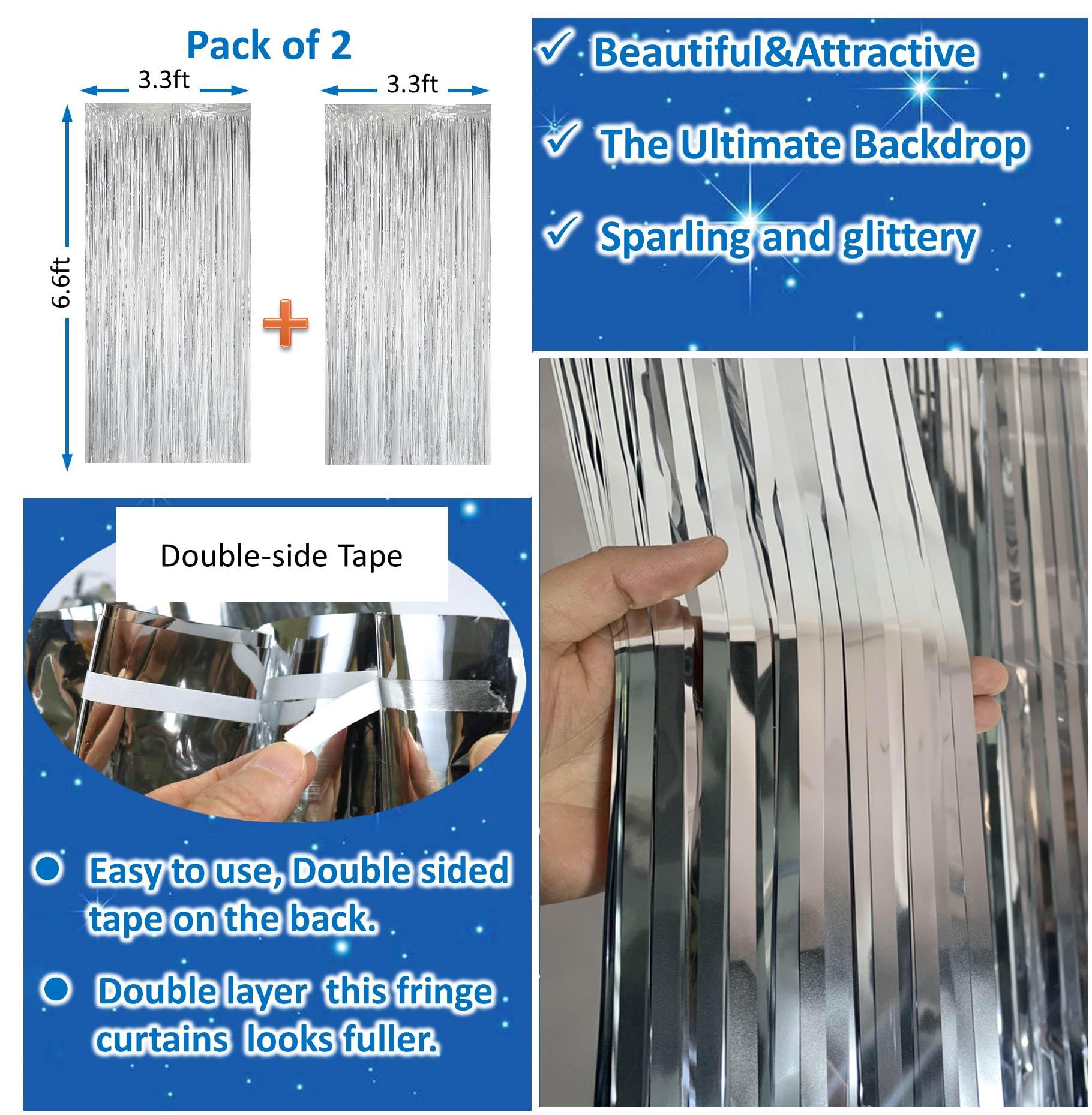 【Package Included】The package include 2pc silver tinsels ,each size is 3.3 x 6.6ft. these silver streamer backdrop are lightweight,durable,sturdy,reusable, not easy to fade. It is really a good silver fringe backdrop curtains for your silver party decorations.