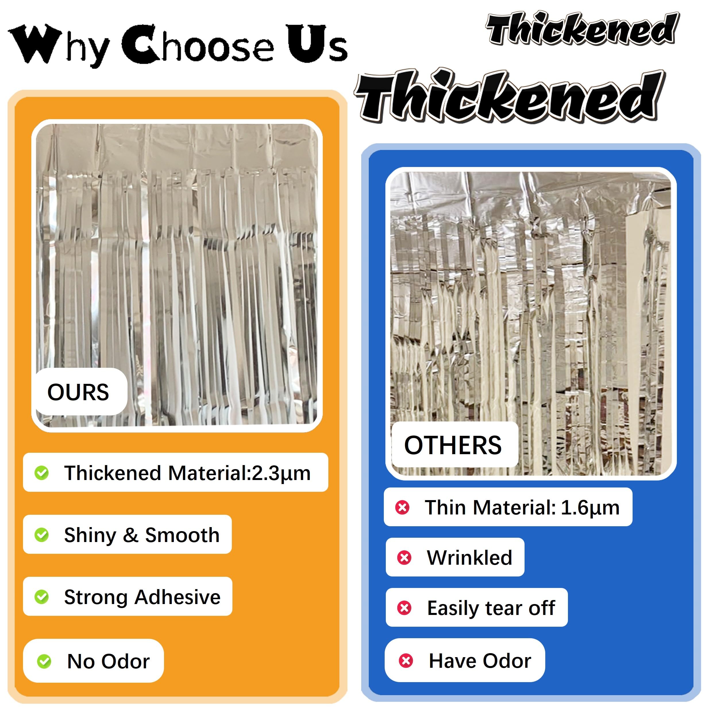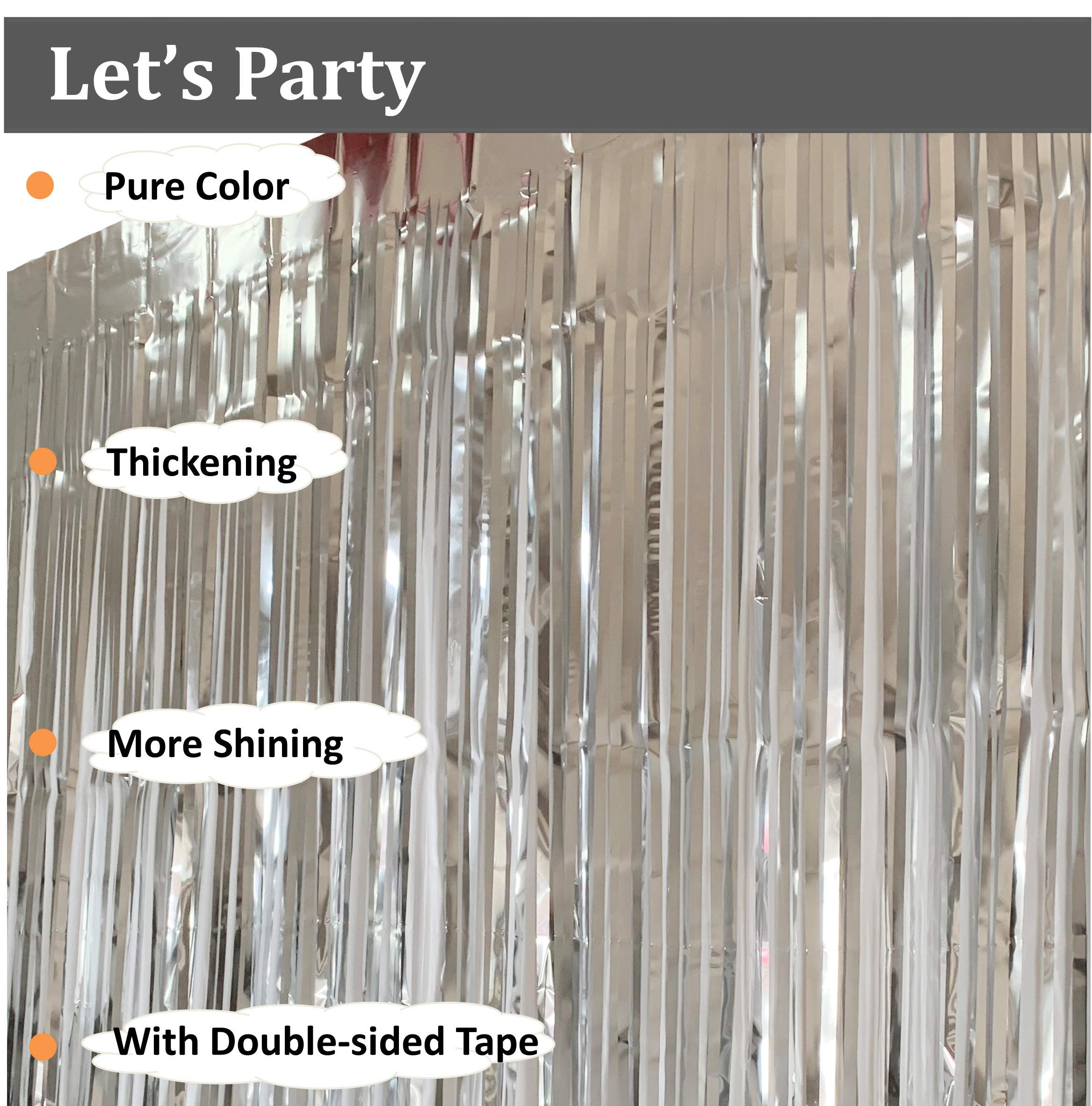 【Material-23μm THICKEN PET】This glitter silver tinsel backdrop is made of 23μm PET film,Non-toxic and Non-fading, Safe for Families with Children and Pets,we use High-Quanlity materials in our silver fringe backdrop.