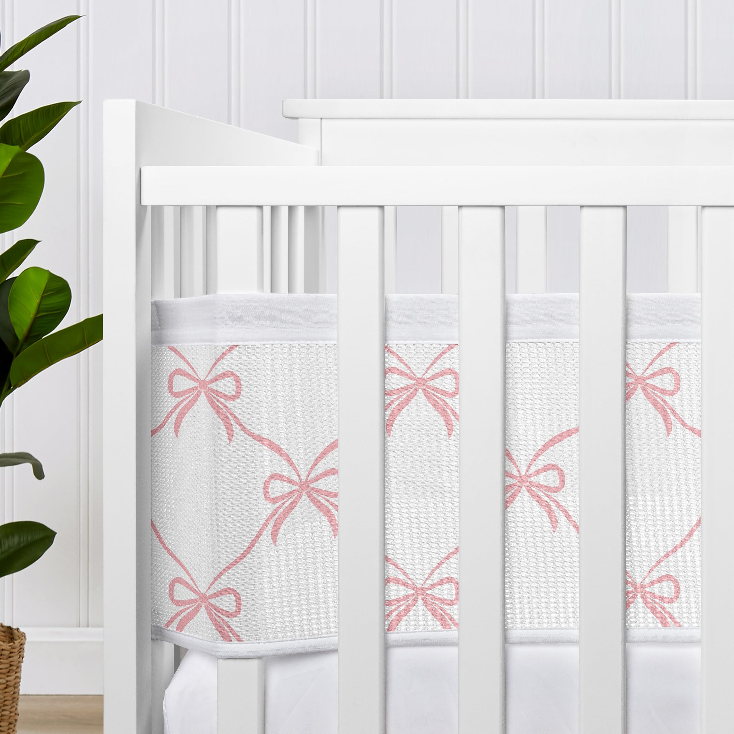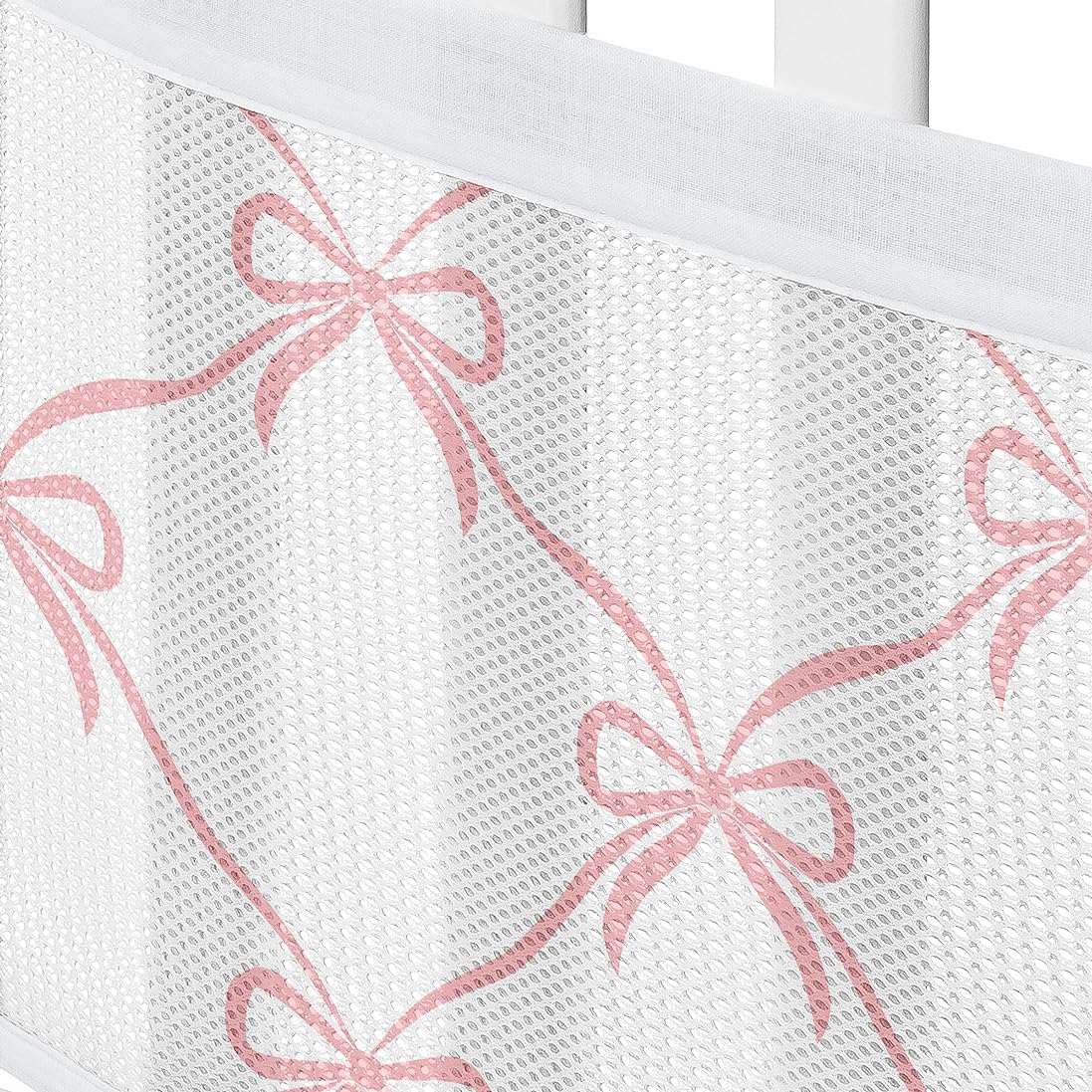 This mesh crib liner features a shabby chic, dancer, princess coquette bows with complimentary color palette from the matching Sweet Jojo Designs Ballerina and Ballet Bow bedding collection of blush pink and white.