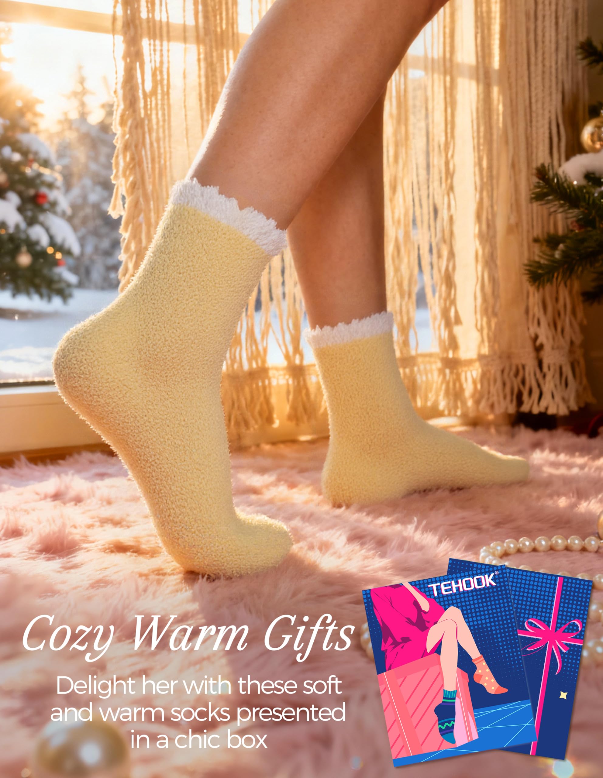 Cozy Warm Gifts for Her: Delight her with these soft and warm fuzzy socks presented in packaging; perfect Christmas Day gifts to tuck into her stocking