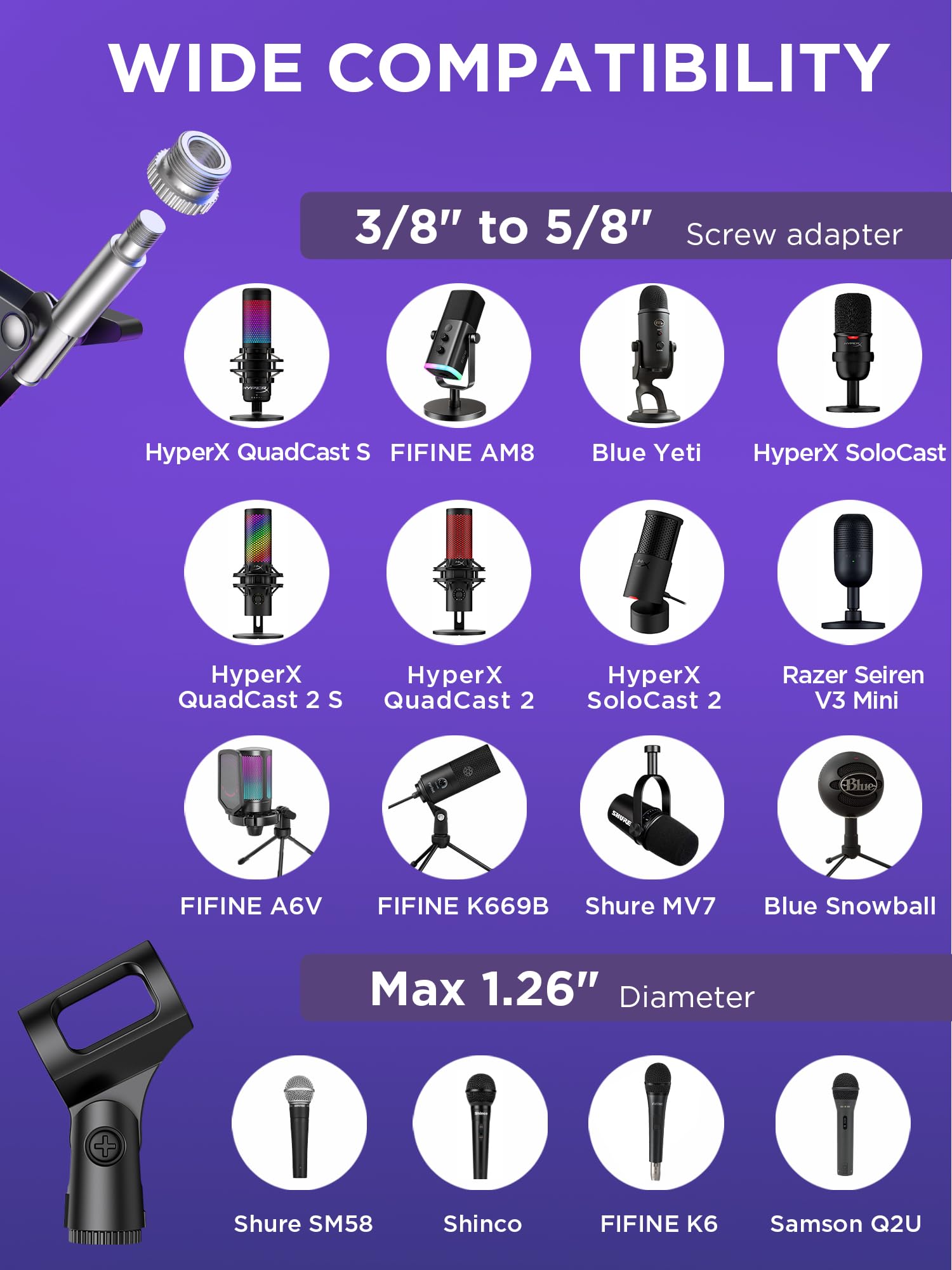 Universal Compatibility& Comprehensive Protection: InnoGear mic arm is engineered to seamlessly fit industry-standard 3/8'' to 5/8'' screw adapters, which is compatible with HyperX SoloCast 2, HyperX QuadCast 2 S, Razer Seiren V3 Mini, HyperX QuadCast 2, Blue Yeti, Blue Snowball, Blue Snowball iCE, HyperX QuadCast, Fifine AM8 and a wide range of standard-sized microphones. The shock mount (not fit for Blue Yeti), crafted from premium materials, features a 52mm hole diameter, slightly larger than standard mounts, and provides enhanced stability and effortless installation.