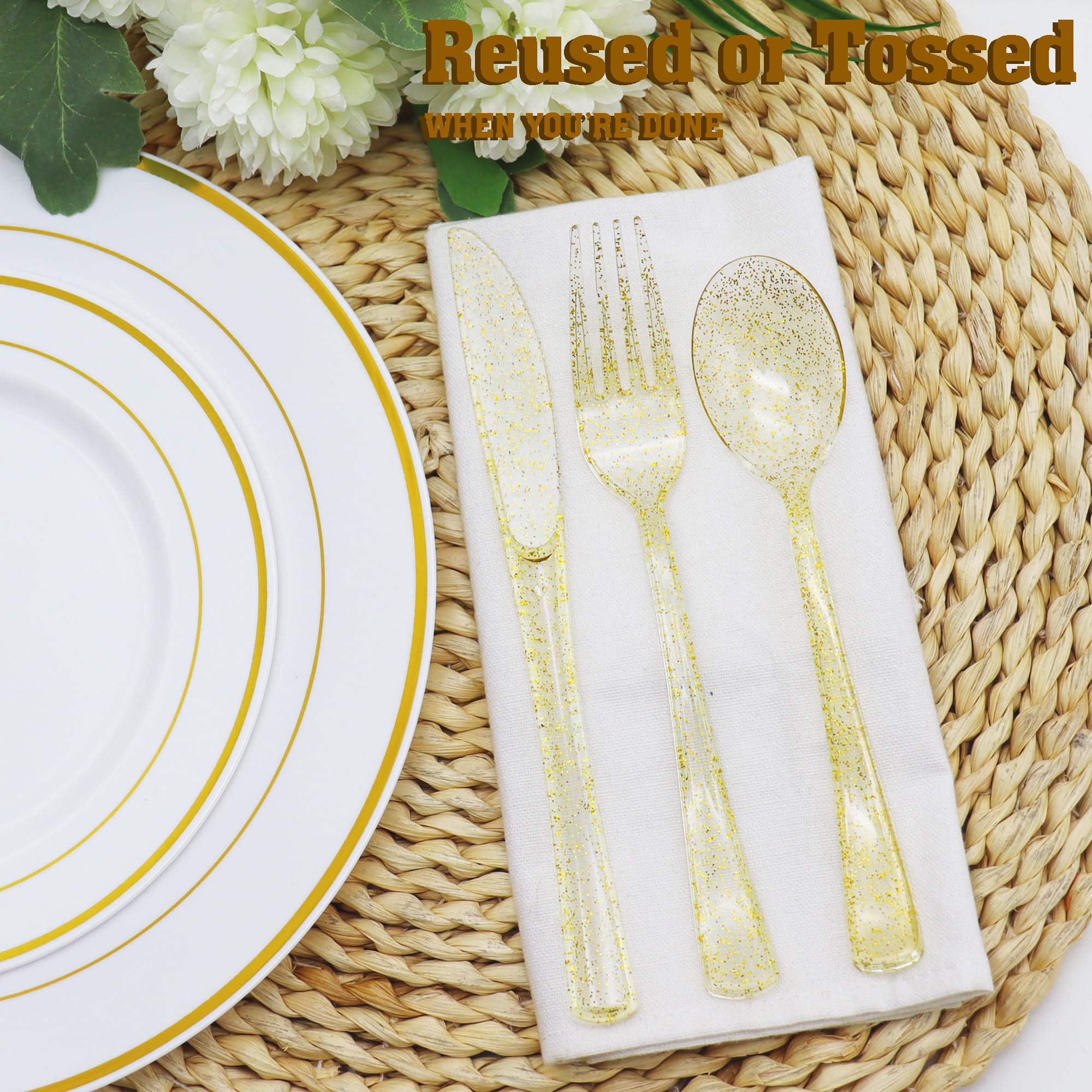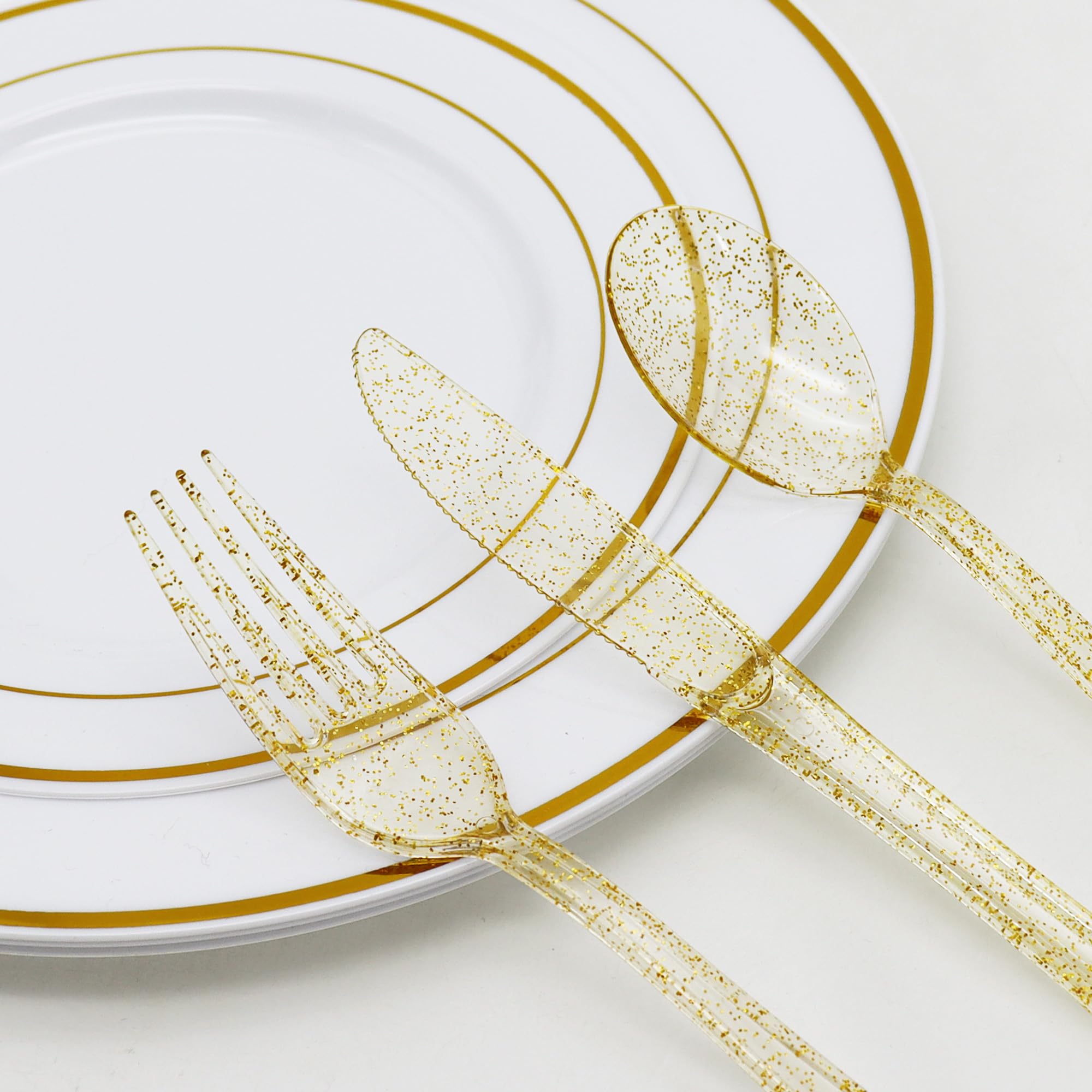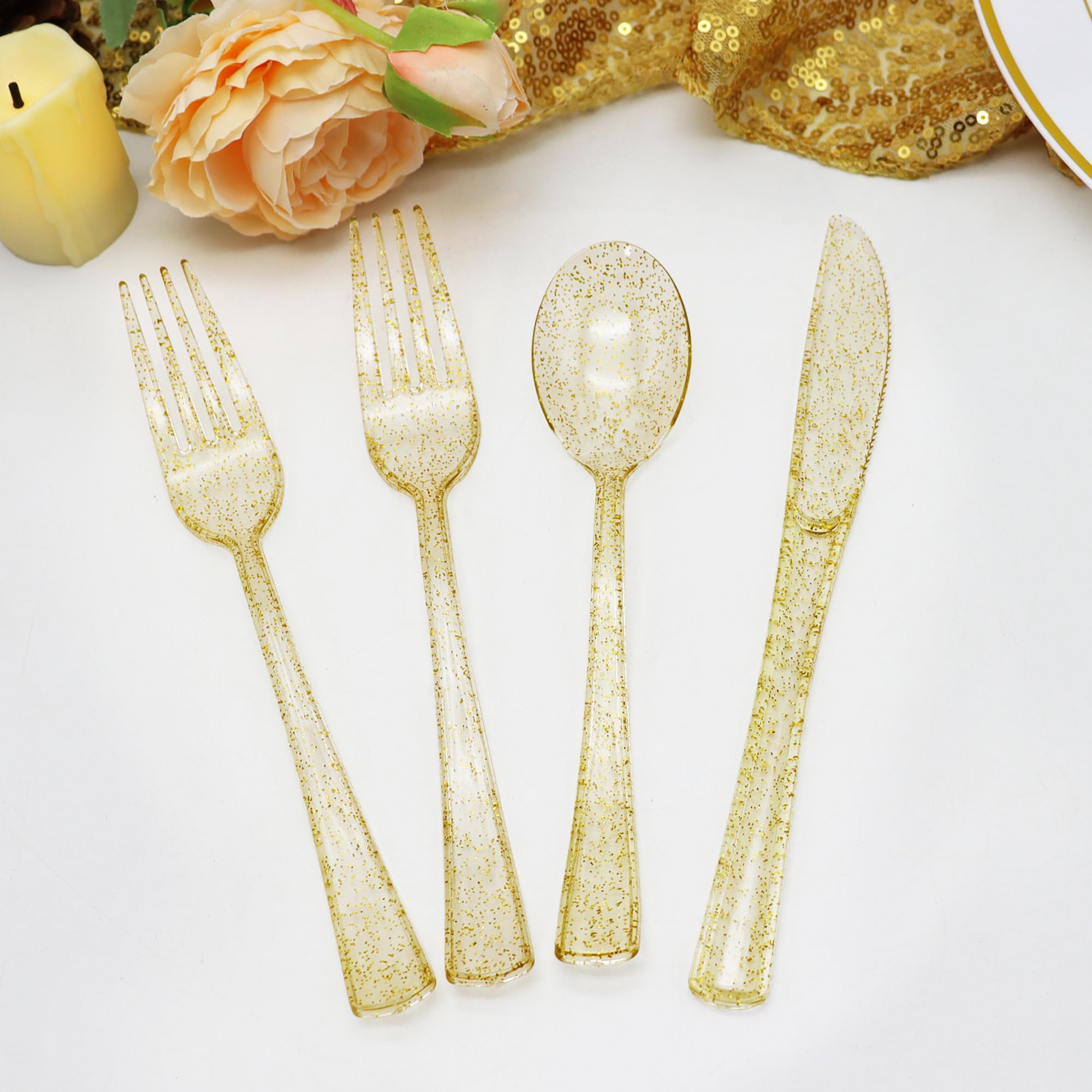 【Gold Glittering Plastic Cutlery】: Gold is a popular color nowadays, in line with modern people's pursuit of fashion. The gold glittering appearance makes the gold plastic silverware look very eye-catching on the table, adding a luxurious and noble feeling to the dining environment. Whether it is used at a family dinner or a banquet party, the gold plastic cutlery can add to the party attraction.