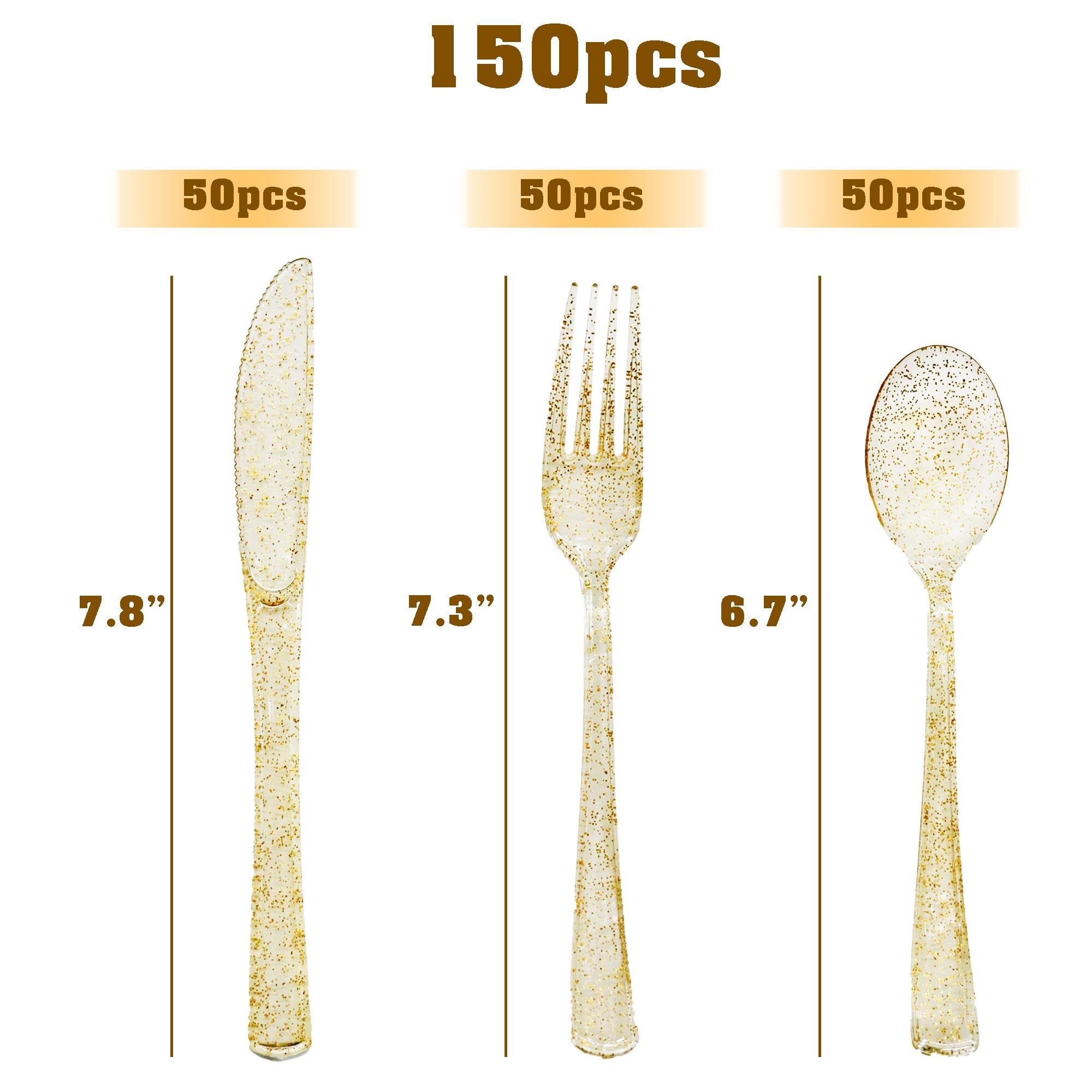 【Large Capacity Set】: This gold disposable silverware set includes 50 gold forks, 50 gold spoons and 50 gold knives, a total of 150 gold plastic cutlery. The set is sufficiently large and affordable. In addition to meeting the daily use of family, party banquet or business use, it can also be used as a beautiful gift choice to meet the needs of more than one person dining at the same time.