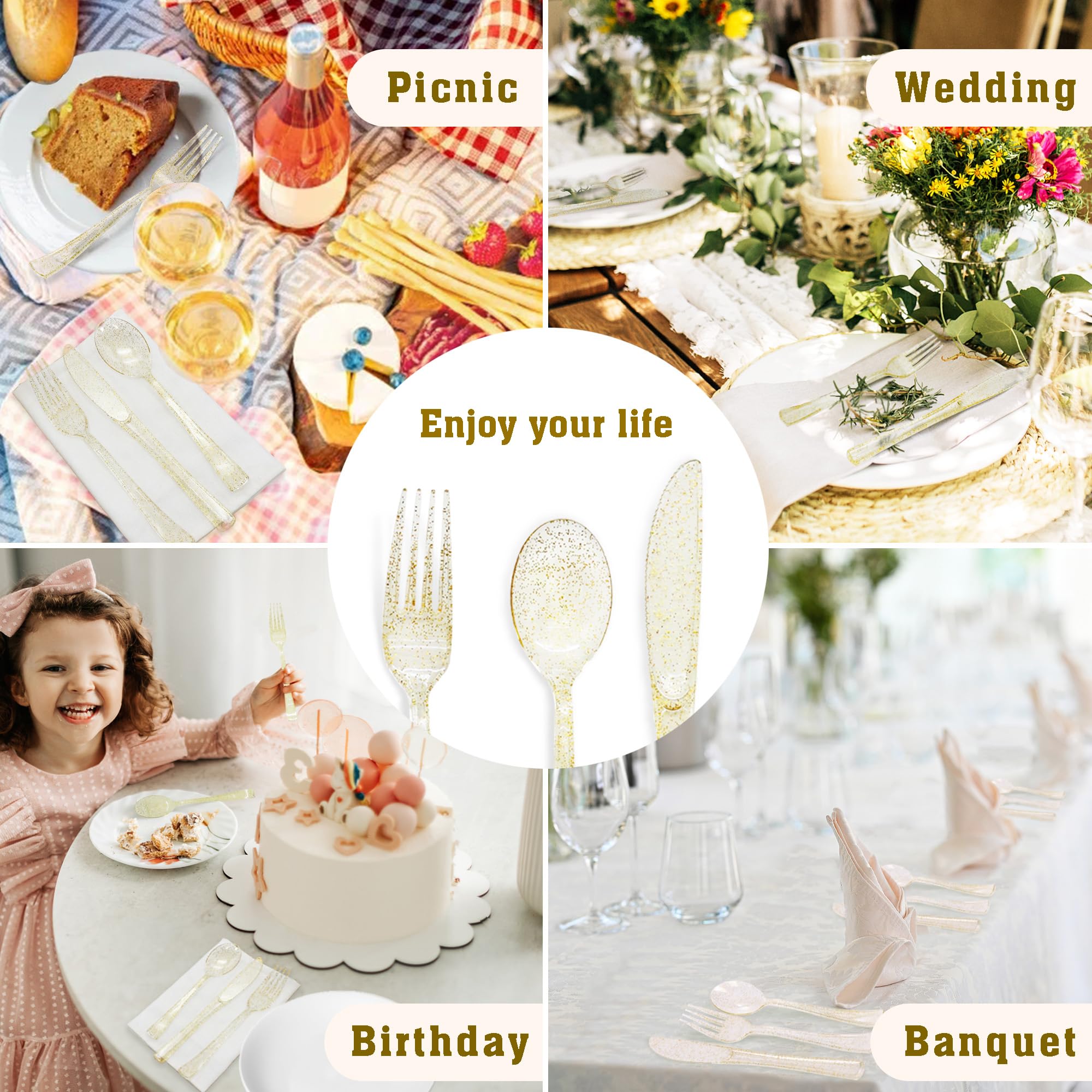 【Multi-Functional Use】: Gold plastic silverware is suitable for a variety of occasions and uses, whether it is used for formal meals,wedding, baby shower, birthday, holiday, family gathering engagement party, picnics, etc. This disposable silverware is able to add a romantic and special atmosphere to these special occasions, attracting people's attention.