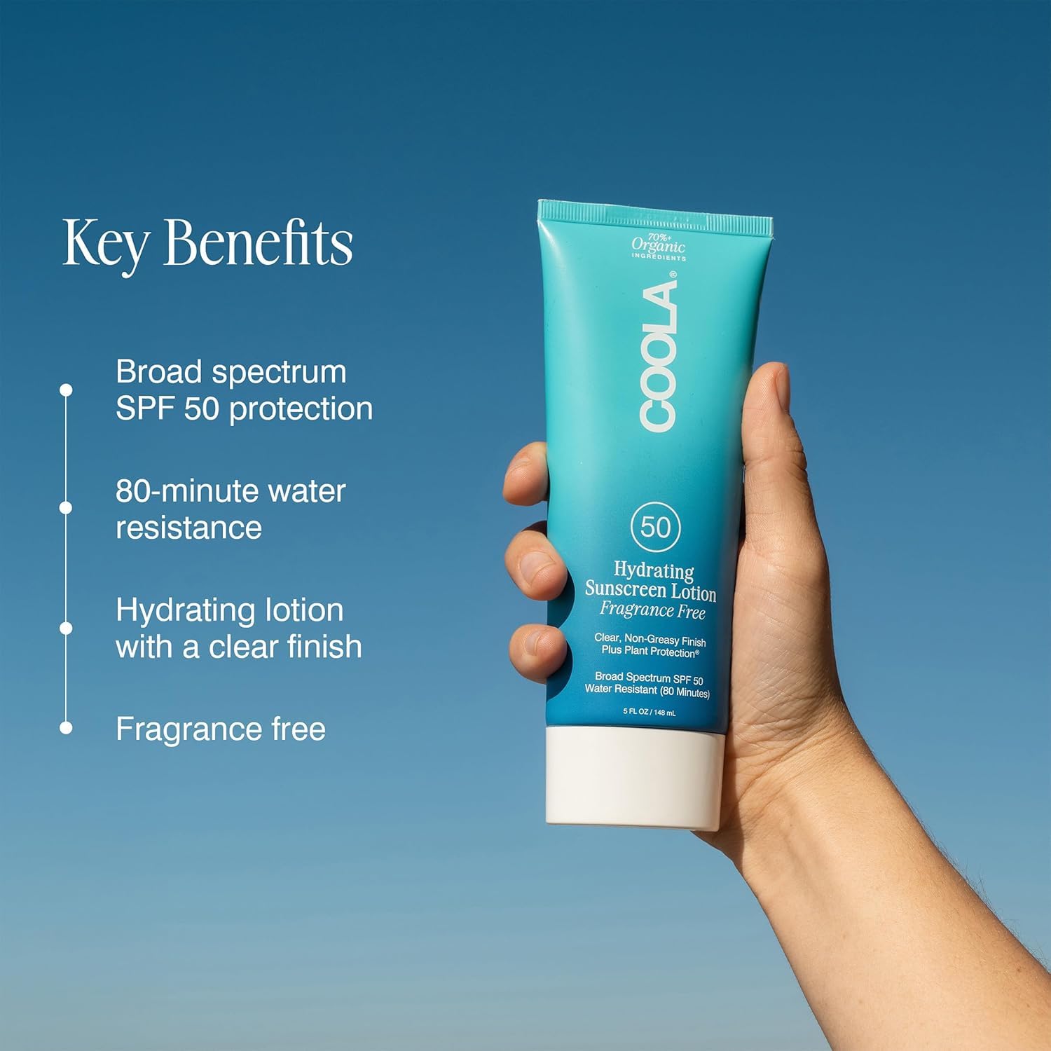 Product Description A lightweight, fragrance-free hydrating body organic clear sunscreen SPF 50 that wears like your favorite moisturizer. Brand Story At COOLA, we're passionate about creating happy, healthy lifestyle experiences. We believe that clean beauty should feel as good as it is healthy, which is why we develop organic products that you'll love wearing every day.