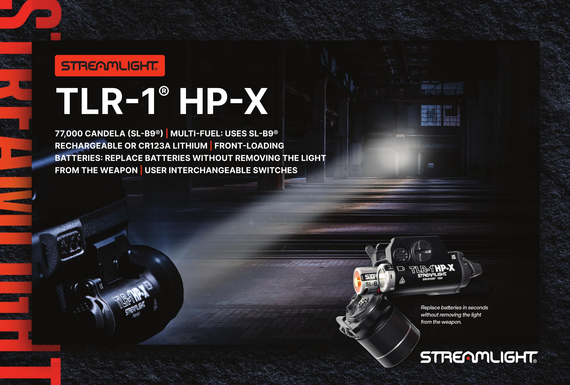 The TLR-1 HP-X delivers an intense high-candela beam for long-range illumination. Designed for efficiency, its front-loading battery compartment ensures quick, hassle-free replacements. Includes standard and extended paddle switches to match your shooting preference. Multi-fuel options let you choose between two SL-B9 rechargeable battery packs or CR123A lithium batteries.