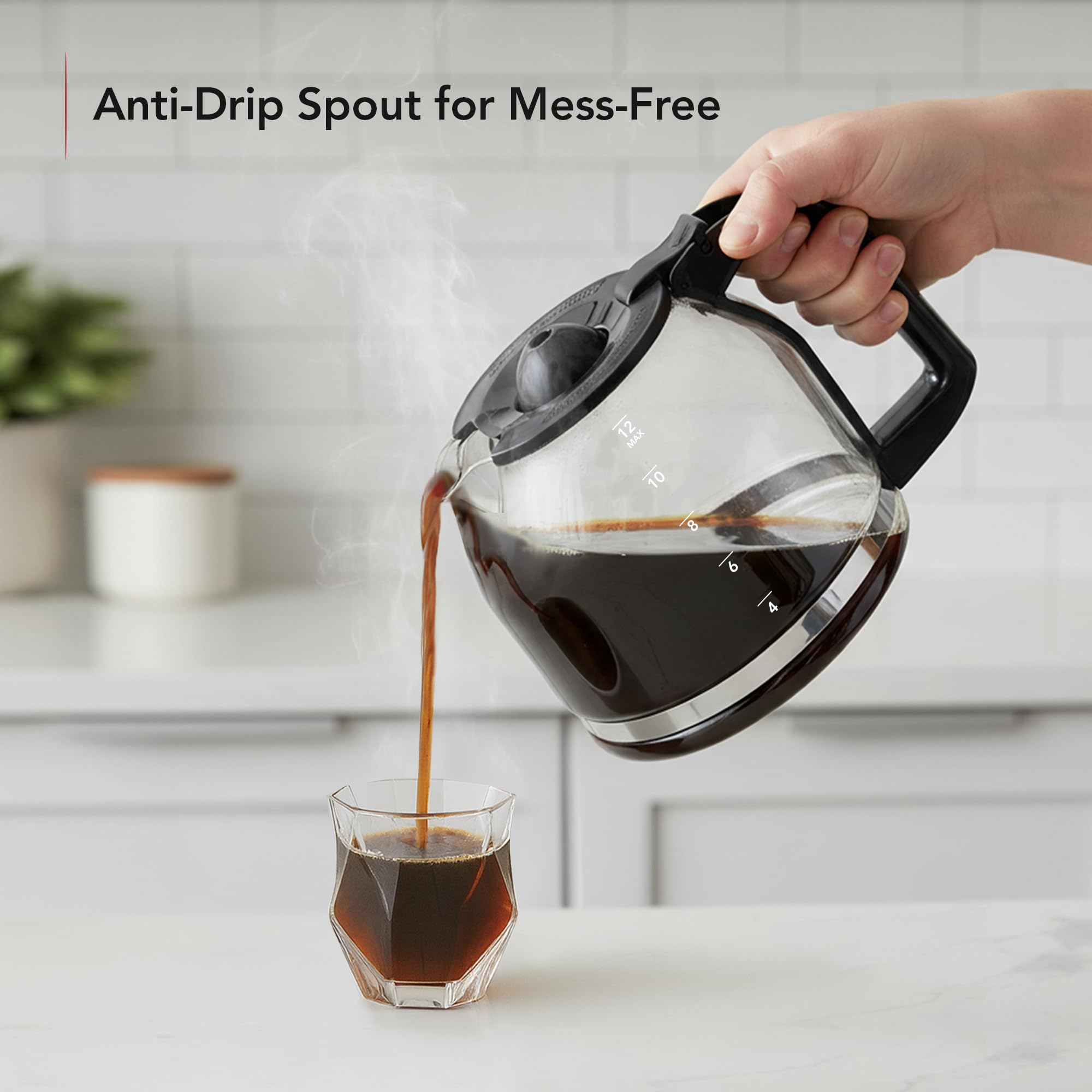 GENEROUS CAPACITY & DURABLE DESIGN β The glass carafe features a large capacity of 1.8 liter that allows you to brew coffee up to 12 full cups which is enough to satisfy your friends, family or colleagues at a gathering. No more waiting for multiple rounds of brewing, serve everyone with ease and convenience!