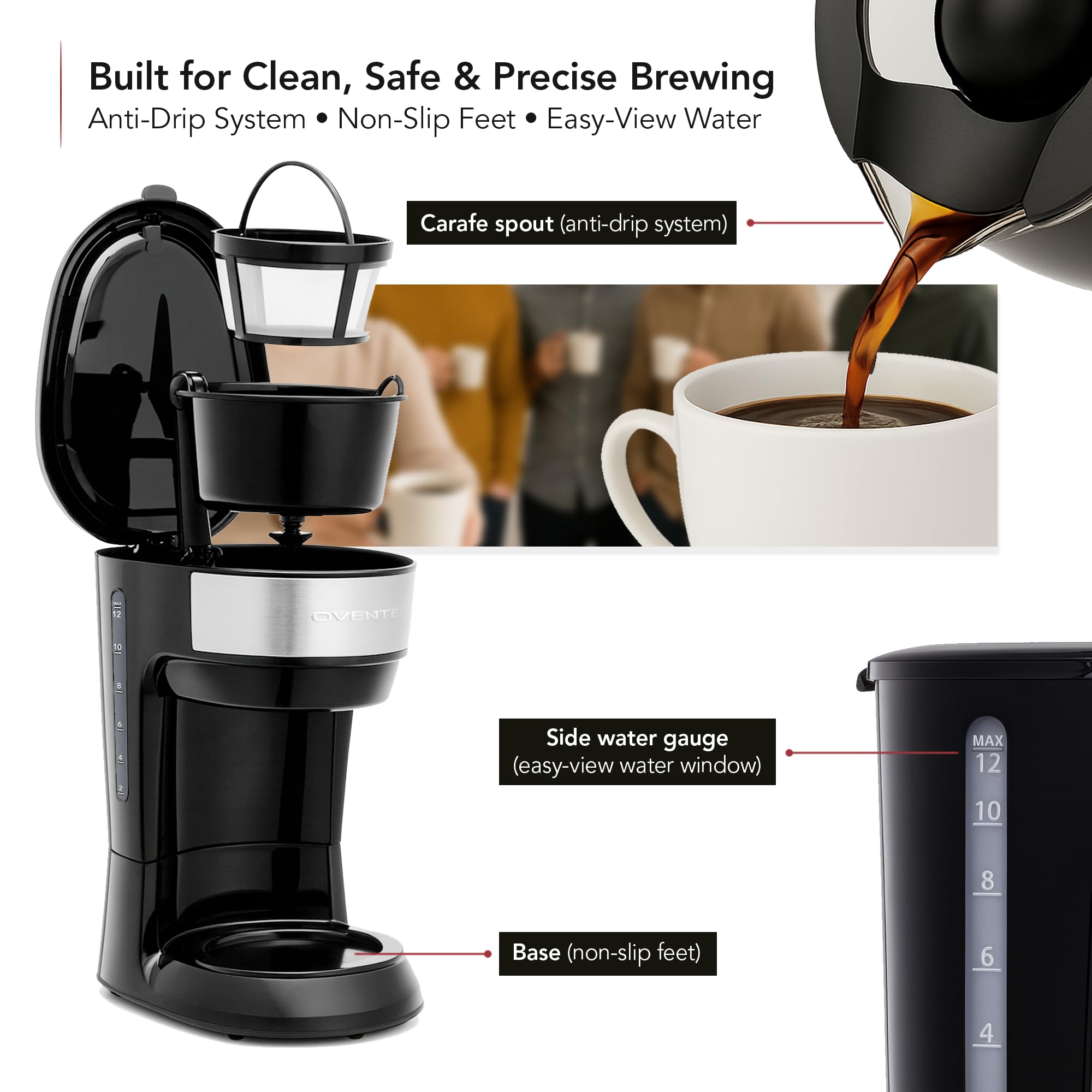 Start your morning out right and perk up your day with a freshly brewed pot of coffee with the OVENTE 12-Cup Drip Coffee Maker CM412B model! Designed to fuel your caffeine cravings and cater to your coffee-loving lifestyle. Discover the joy of brewing exceptional coffee at home and experience the enticing aromas, bold flavors and convenience of an excellent coffee machine right at your fingertips. Built with one-touch operation so you can start brewing your coffee with just a single push of a button. In addition, the coffee pot is made of borosilicate glass that can withstand heat and preserve the temperature. This coffee maker is crafted with additional features such as easy-view water gauge, anti-drip, non-slip feet and reusable filter for added comfort and convenience. Elevate your mornings and boost your coffee routine with this 12-cup drip coffee maker, delivering a seamless brewing experience and a perfect cup of coffee every time. Whether you're brewing for yourself or entertaining guests, this coffee maker is the ideal choice for reliable, flavorful and convenient coffee enjoyment.