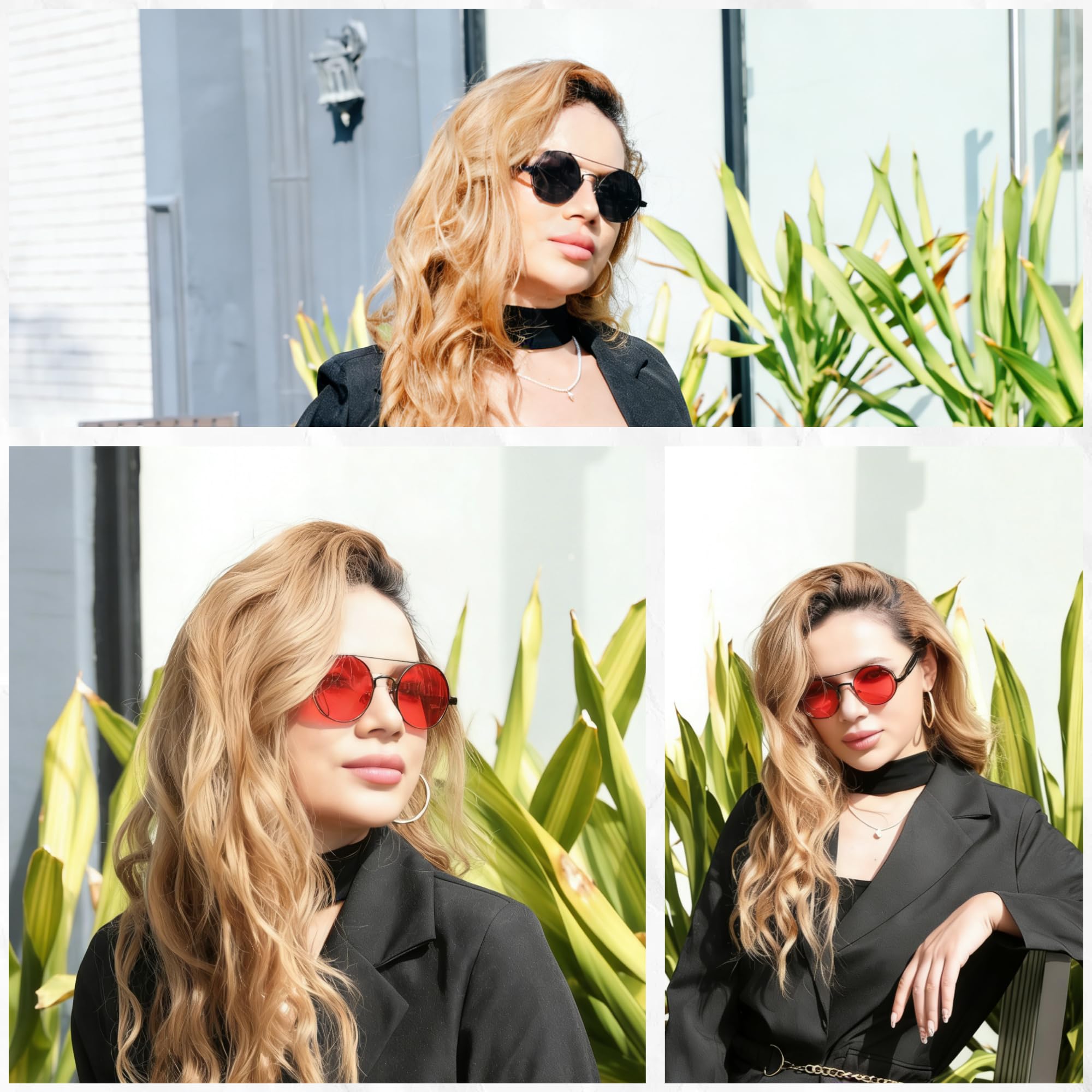 FEISEDY Round Aviator Steampunk Sunglasses Design: The retro steampunk sunglasses are designed with a round metal frame, classic and elegant. With double bridge design, enhances the luxurious and textured feeling of the glasses. With a creative metal frame, retro, and rock.