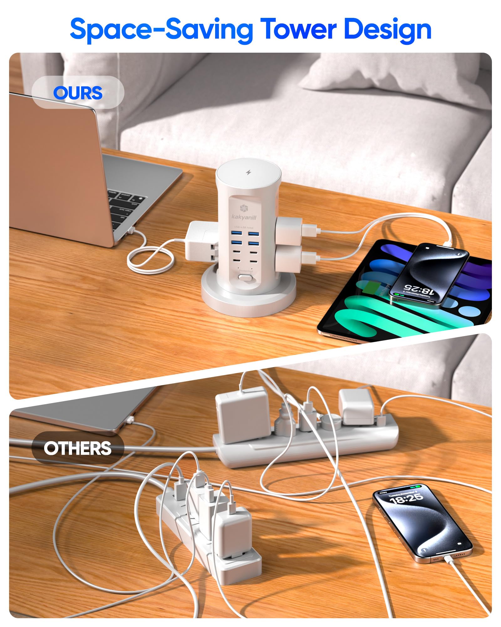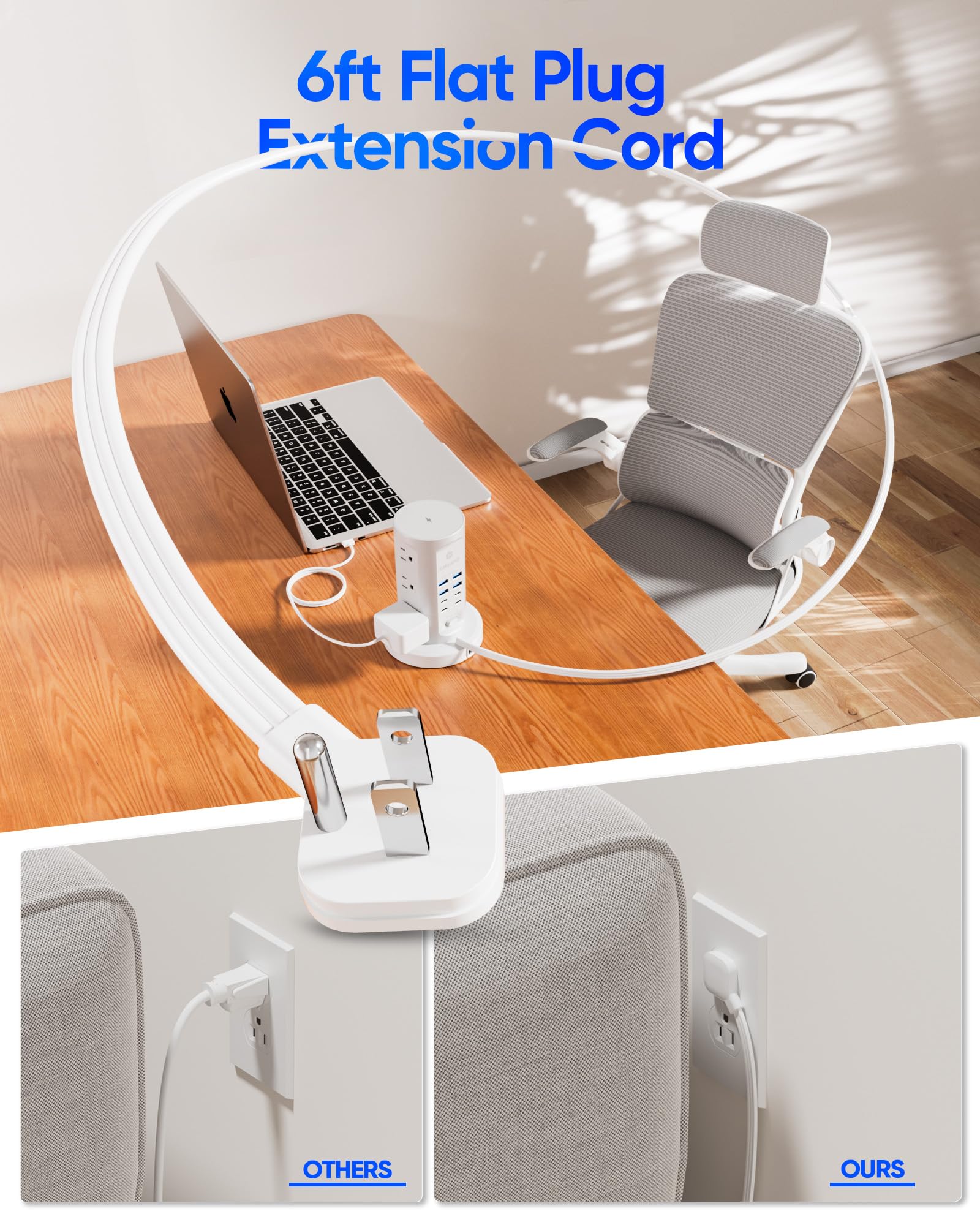 Space-Saving Tower Design & Retractable Cord. Maximize your workspace with a vertical tower layout and 6FT retractable flat cord. The ultra-slim 0.35" plug and 45° angled design fit seamlessly behind furniture, desks, or appliances, while the retractable base eliminates cord clutter—rotate to store or pull out for extended reach