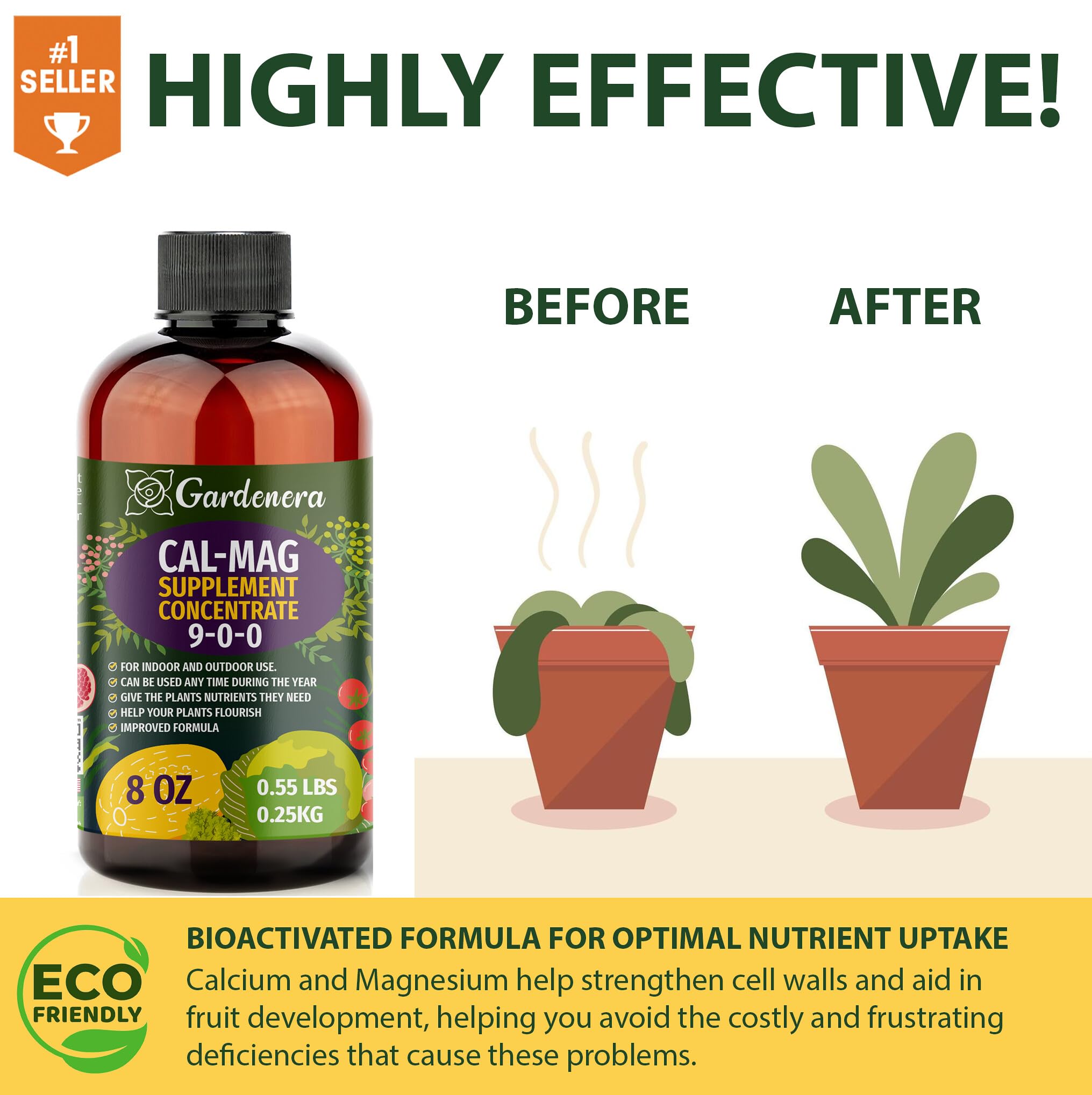Gardenera Cal-Mag Plus: Comprehensive Plant Nutrient Supplement Enhance your plant's health and growth with Gardenera Cal-Mag Plus, a highly fortified calcium, magnesium, and iron plant supplement. Designed to correct common deficiencies, Gardenera Cal-Mag Plus is an essential addition to your existing nutrient program, especially when using reverse osmosis water, or growing in soil or coco coir-based media. Key Benefits: Organic Cal-Mag for All Plants: Contains organic calcium, magnesium, and micronutrients micro-chelated with organic acids for superior bio-availability. Prevents Common Growth Deficiencies: Regular application supports strong stalk and leaf health throughout all growth stages. Use 1-2 mL per gallon. Versatile Compatibility: 100% compatible with other nutrient systems, enhancing the bio-availability of other minerals. Highest Quality Ingredients: Our ingredients are better for plants, better for you, and better for the planet, providing the best value and yielding the biggest harvests. Made in the USA: Formulated by sustainability-conscious plant scientists and craft growing enthusiasts using the highest quality ingredients and manufacturing methods. Product Features: 9-0-0 NPK Formula: A robust formulation ensuring balanced nutrition for your plants. Multi-Use Application: Mix with regular waterings or apply as a foliar spray to boost growth. Versatile Growth Media: Suitable for containers, coco, hydrogardens, and soil-based growing. Directions for Use: Mixing: Blend well with water, using 1-2 mL per gallon. Application: Use with every watering as needed. For enhanced growth, apply as a foliar spray. Compatibility: Perfect for supplementing any nutrient program, particularly beneficial for plants in reverse osmosis water or coco coir-based media.