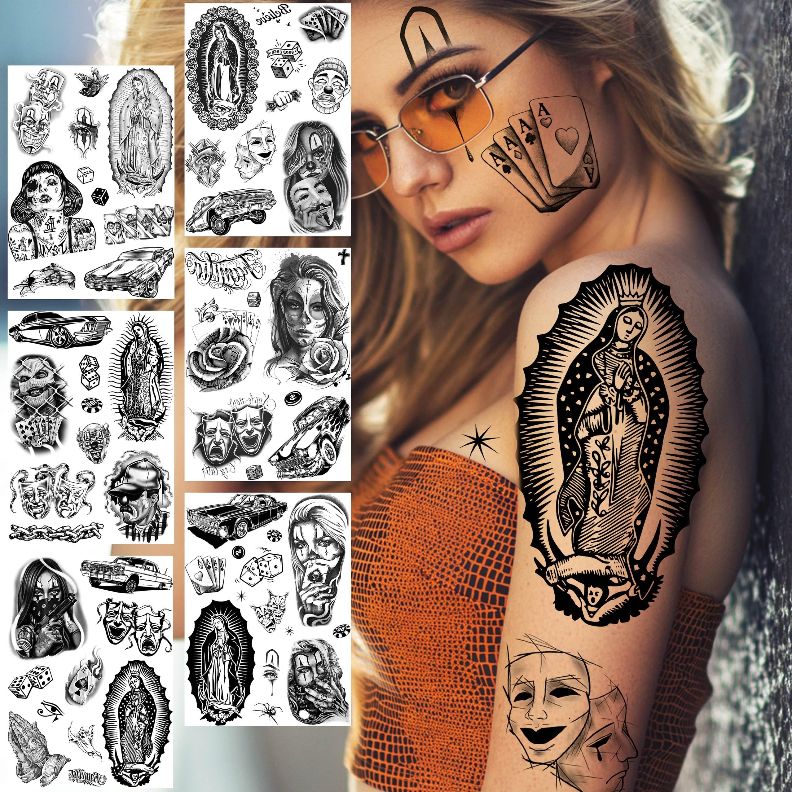 🐳[6 Sheets Large Chicano Temporary Tattoos For Men And Women in One Package] - Original Brand of TASROI 3D Xicana Xicano Chicana Temporary Tattoos For Women Men Arm Sleeve. Tattoos Temporary Mexico Culture Gansta Laugh Now Cry Later Lowrider Car Guadalupe Payasa Day Of The Dead Gambler Religion Gangster Familia Prison Inmate Prisoner Rapper Dollar Bills Chips Dice Faith Belief Joker Gothic Clown Goddess Our Lady Of Guadalupe Loyalty Power Success Temptation Wealth Auto Robber Virgin Mary Etc.