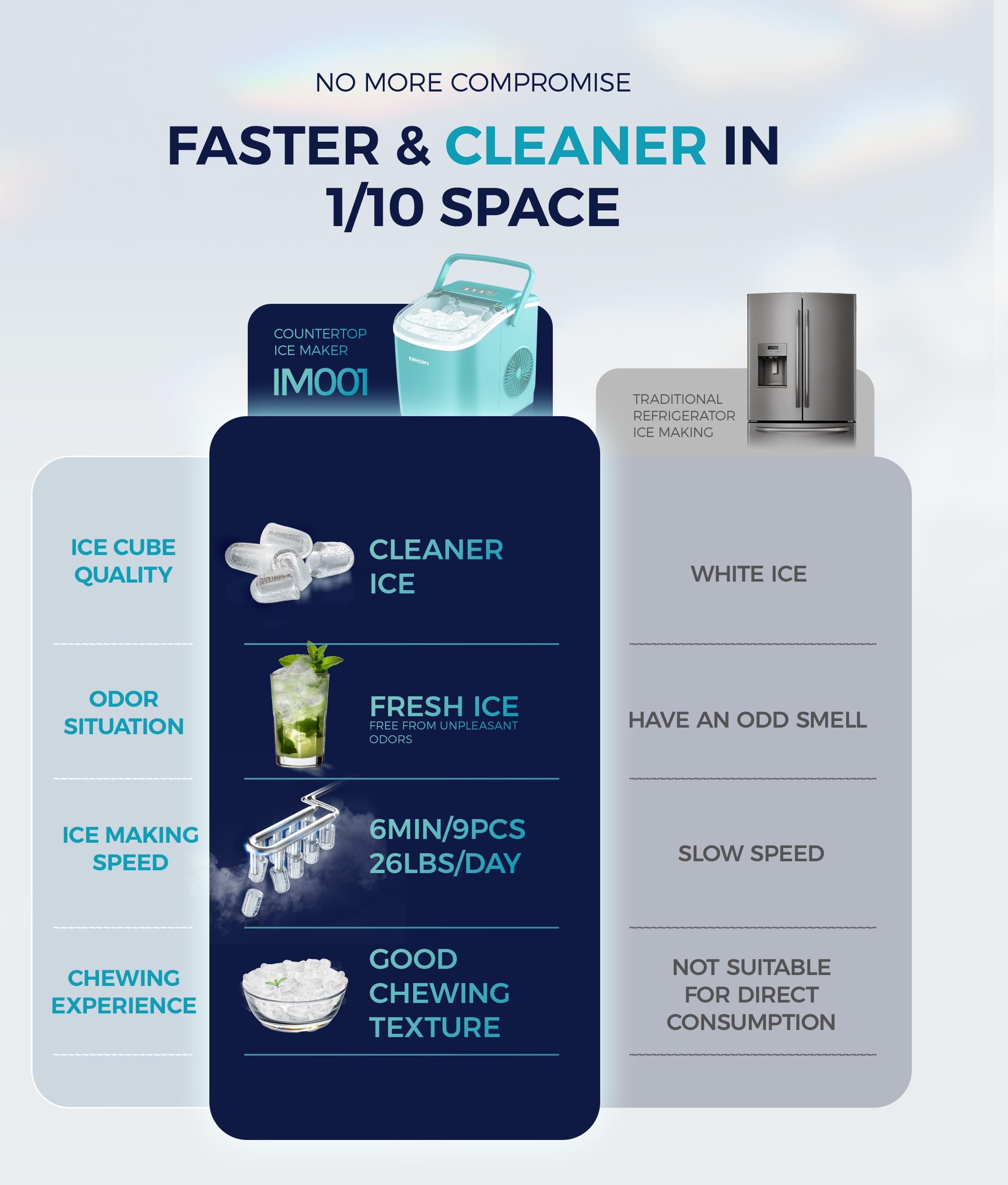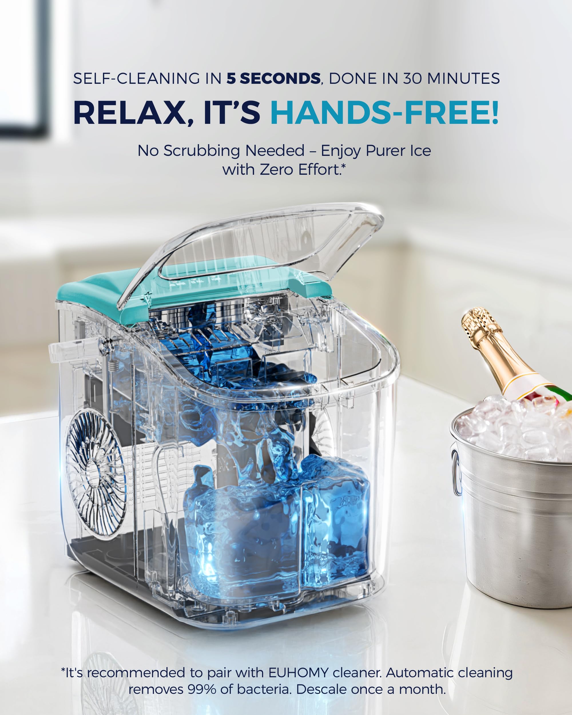 6 Mins Ice-Making & Ultra Quieter: Our Euhomy ice maker only takes 6mins that will enjoy the first batch of fresh bullet ice. With a 1.2L water tank and powerful compressor, the portable ice maker easily makes maximum ice capacity to 26lbs ice per day and holds up to 1.3lbs ice at a time. Also, our ice maker is not only excellent in refrigeration, but also at less than 45db normal noise, ensuring a comfortable and quiet environment to enjoy ice-making, similar to a working freezer