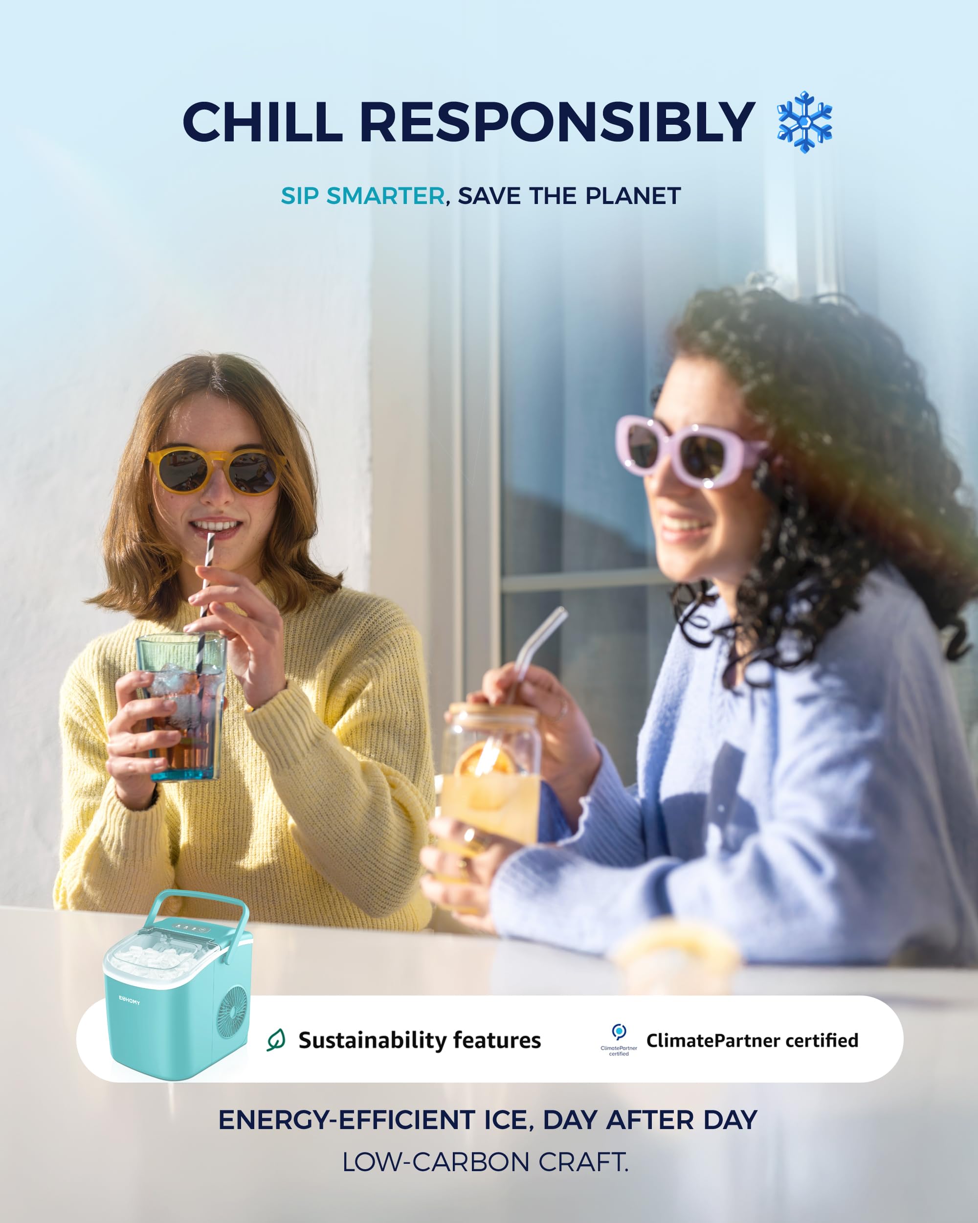 Portable Design & Bullet Ice: Our ice maker comes with a sturdy handle, weighs only 13.89lbs and with compact size 11.57(L)x11.42(W)x8.74(H)in. Those features make ice maker easy to carry and perform well on any occasions like Kitchen/Home/Camping/RV/Party/Dorm. Also, the newly designed countertop ice maker produce the most popular bullet-shaped smooth ice cubes, which won't stick together easily or hurt your hands or mouth even are excellent for cold drinks, iced coffee or chew as snacks